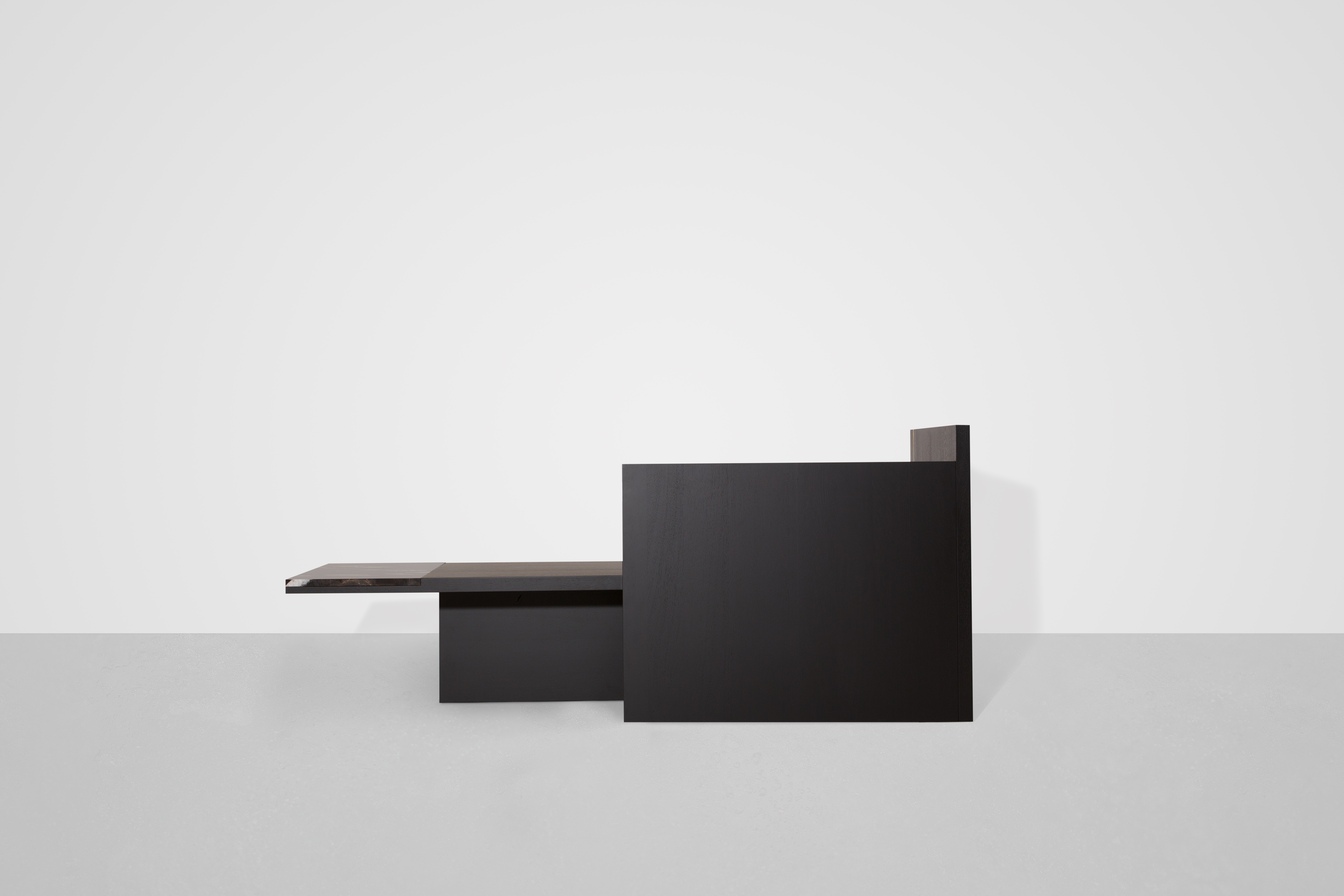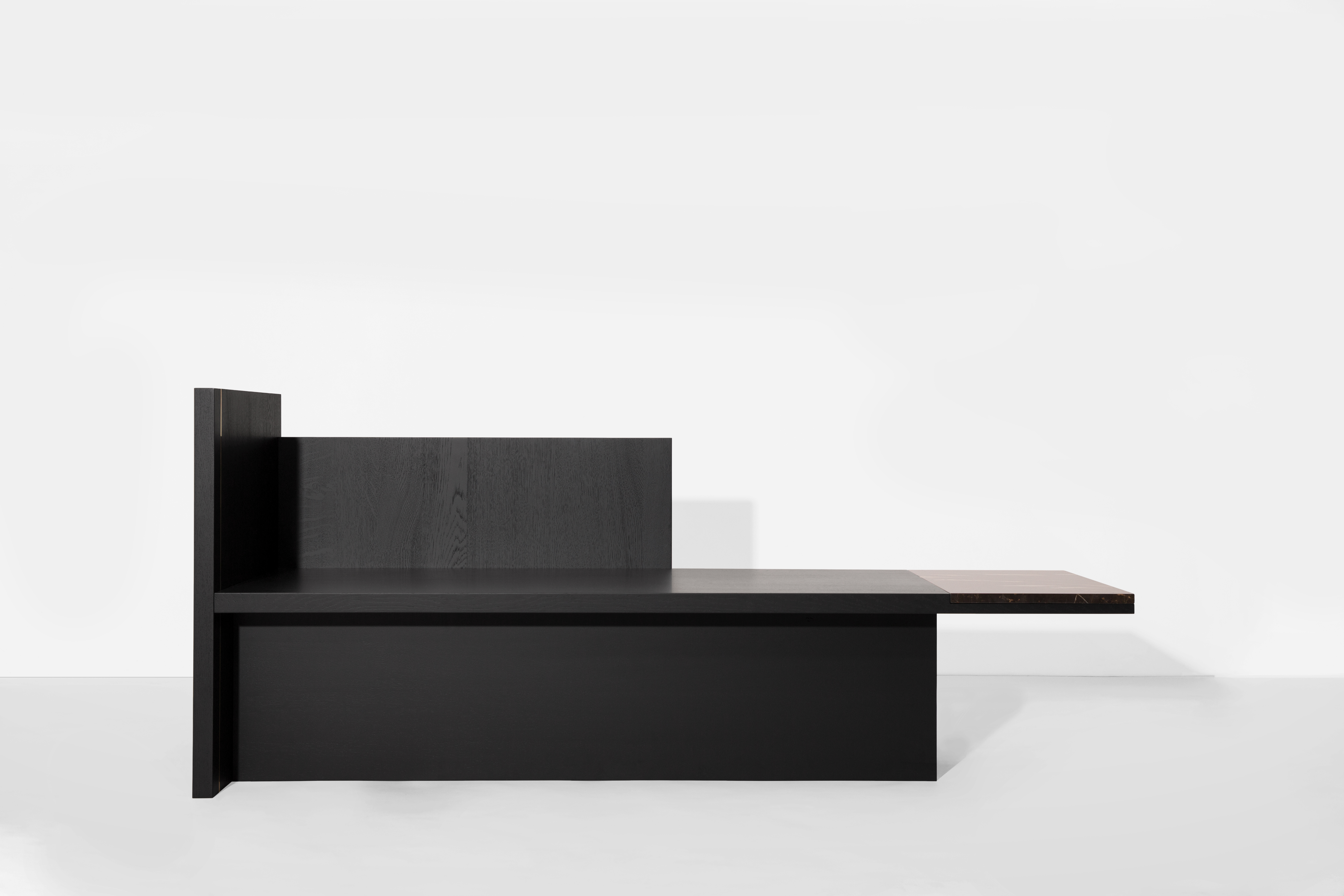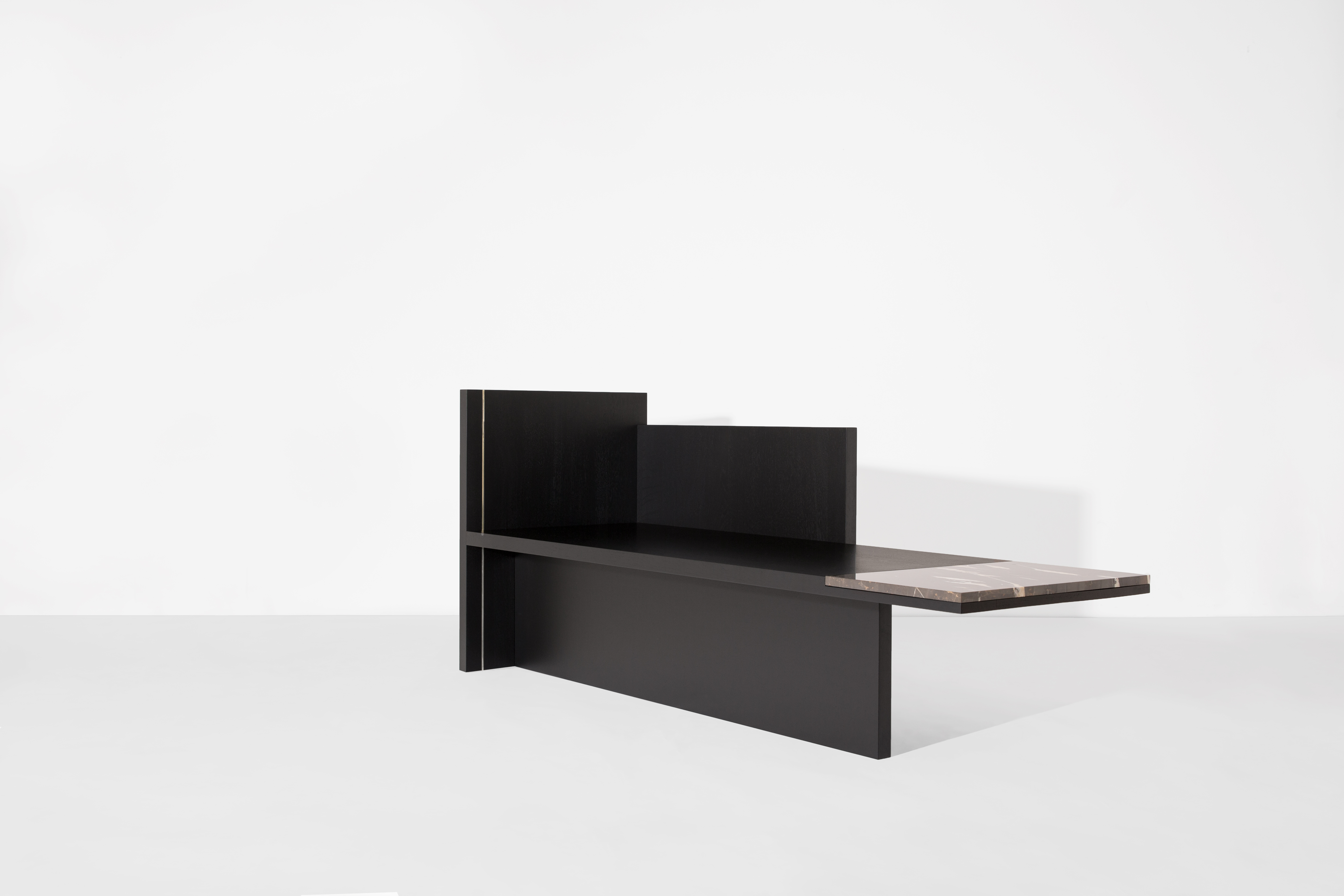 This edgy piece’s strong aura is dominated by black stained oak. The Chaiselongue rests in itself with no urge to be utilized. This self-confident approach is subtly highlighted by a brass pilaster and a risky marble cantilever. It enters a dialogue with its counterpart by vividly refusing to speak.