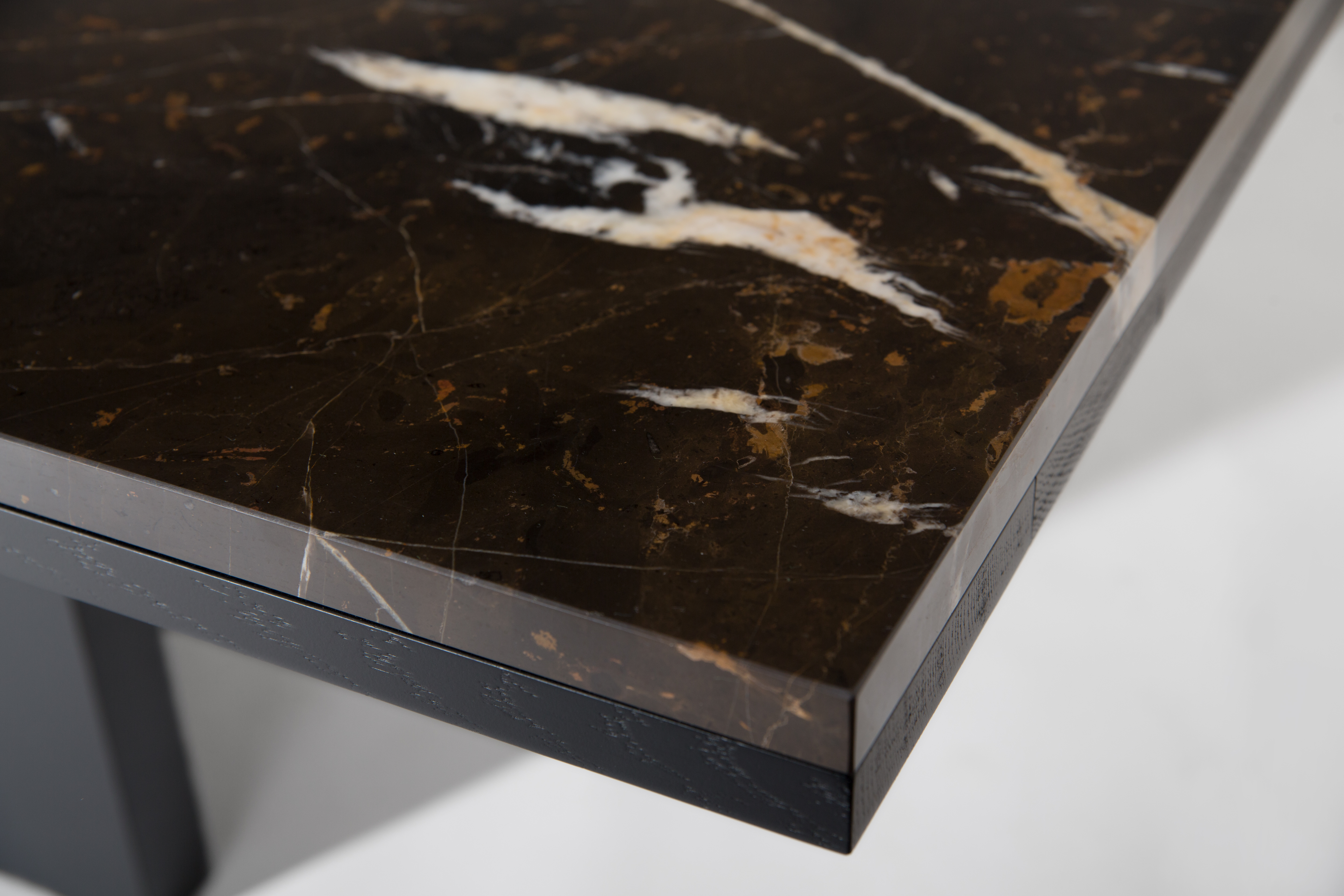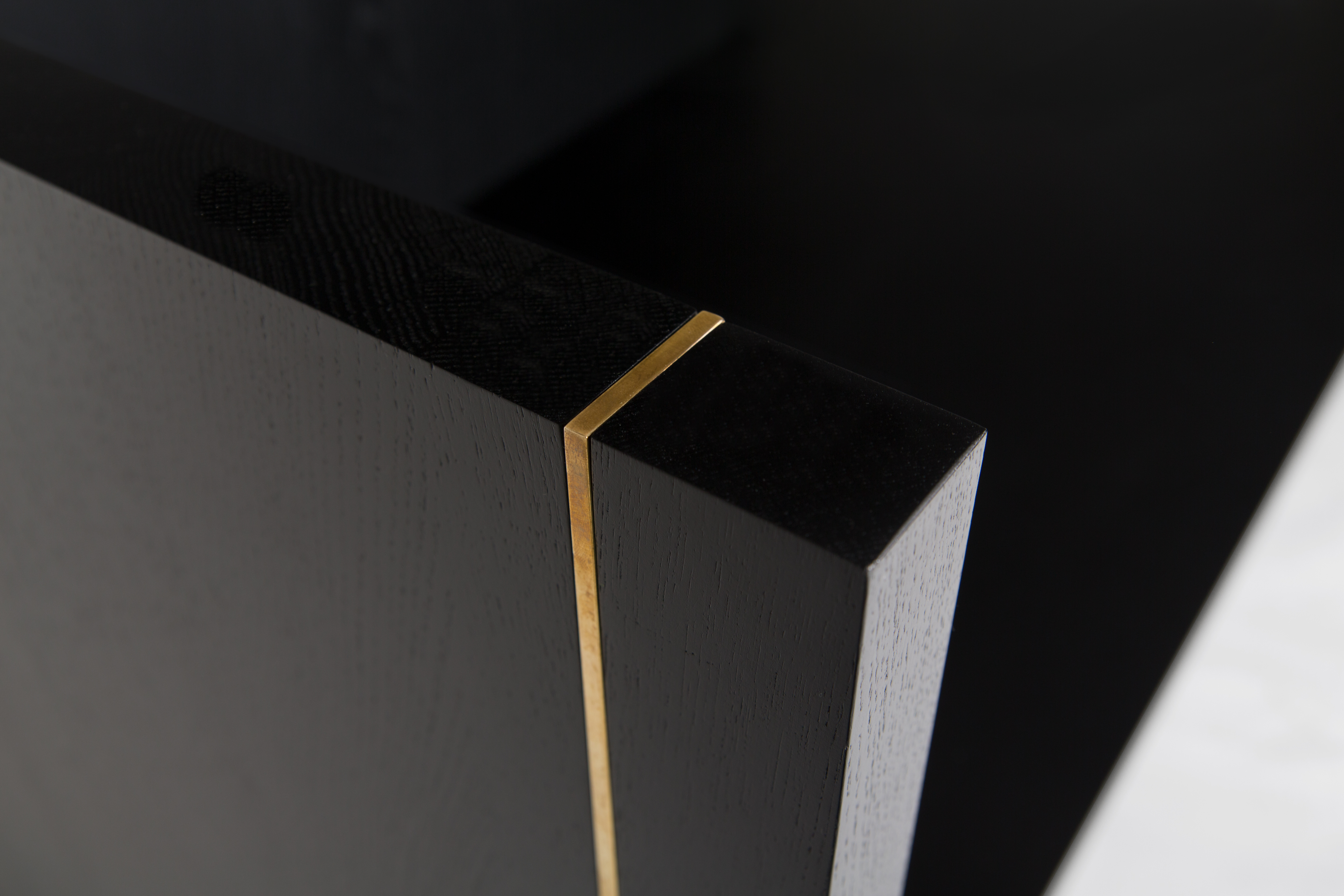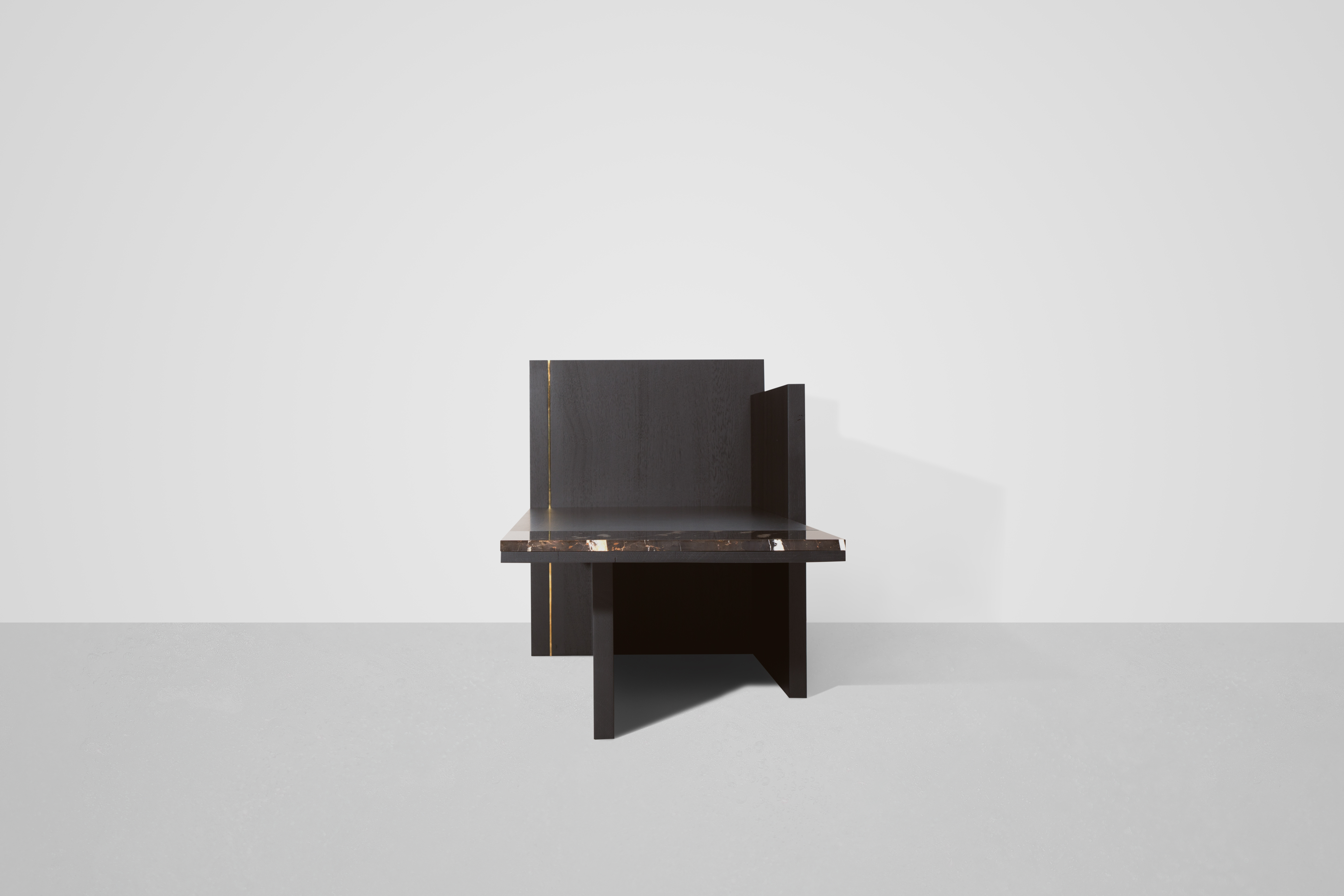 This edgy piece’s strong aura is dominated by black stained oak. The Chaiselongue rests in itself with no urge to be utilized. This self-confident approach is subtly highlighted by a brass pilaster and a risky marble cantilever. It enters a dialogue with its counterpart by vividly refusing to speak.