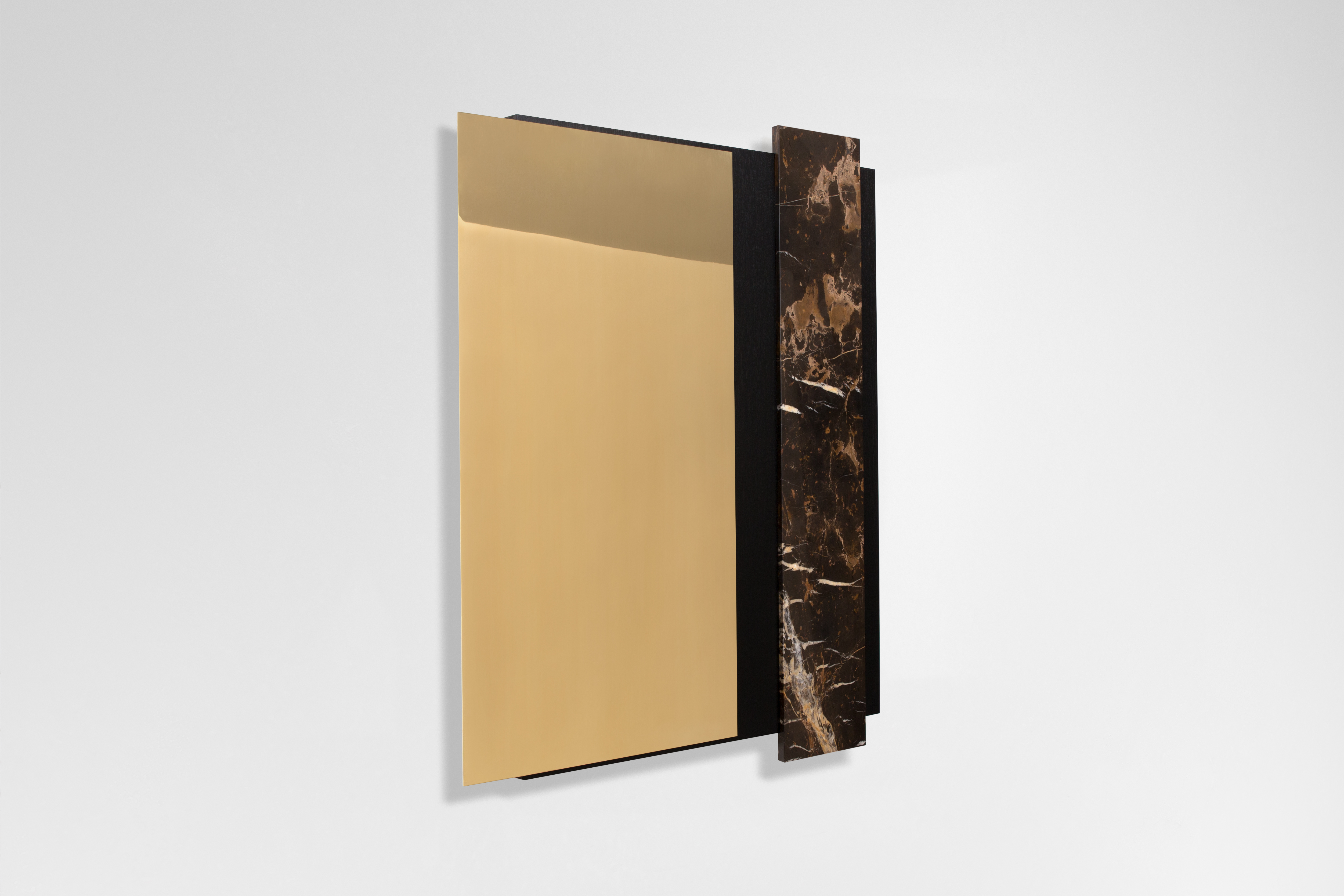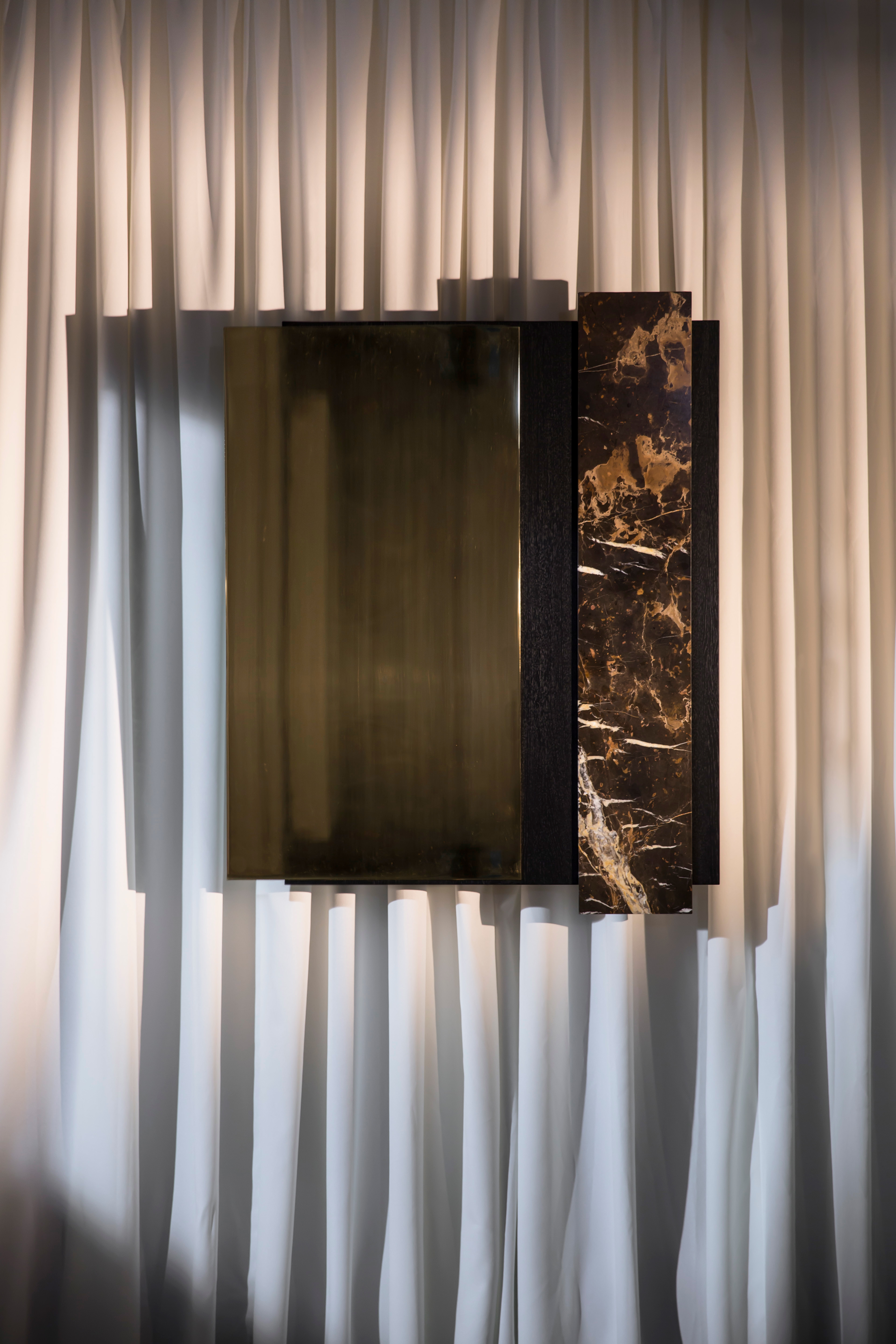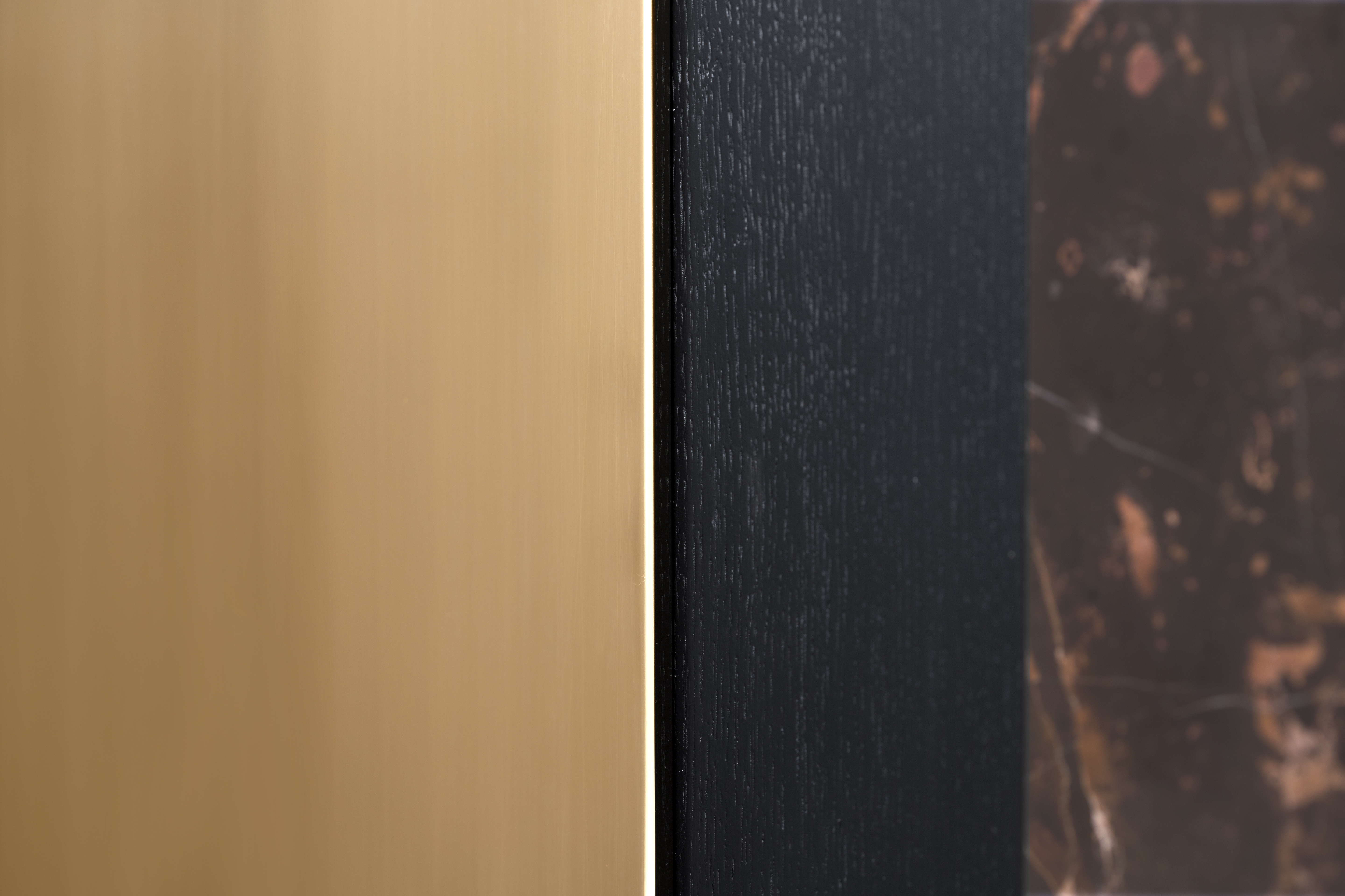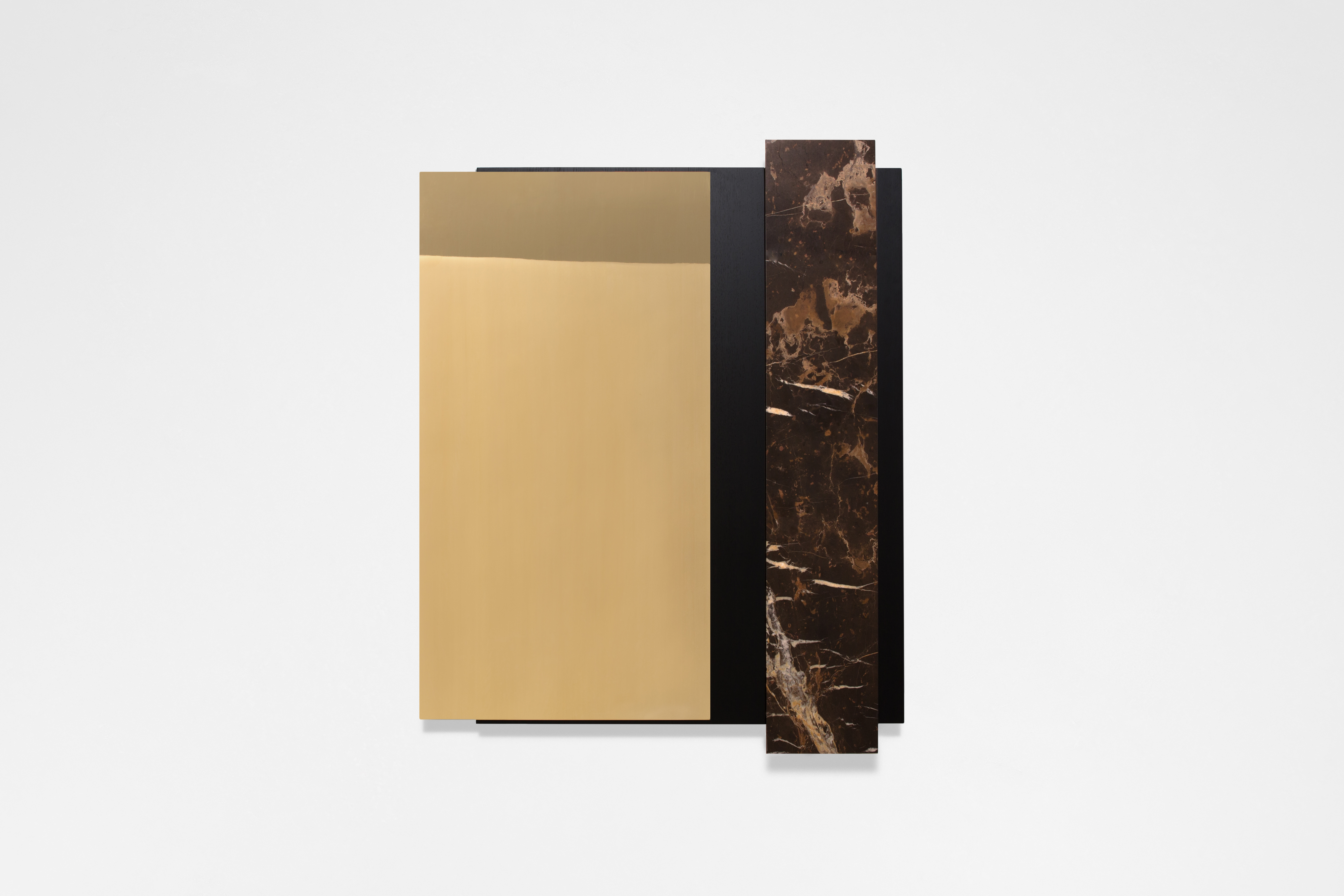 The Glory unveils and distorts its beholder’s most significant other in a single moment. This transcendence of reality naturally decreases with time as the refraction grows blurrier and weaker. The glorifying brass sheet is kept in place by a black oaken base and antagonized by a vertical marble piece.