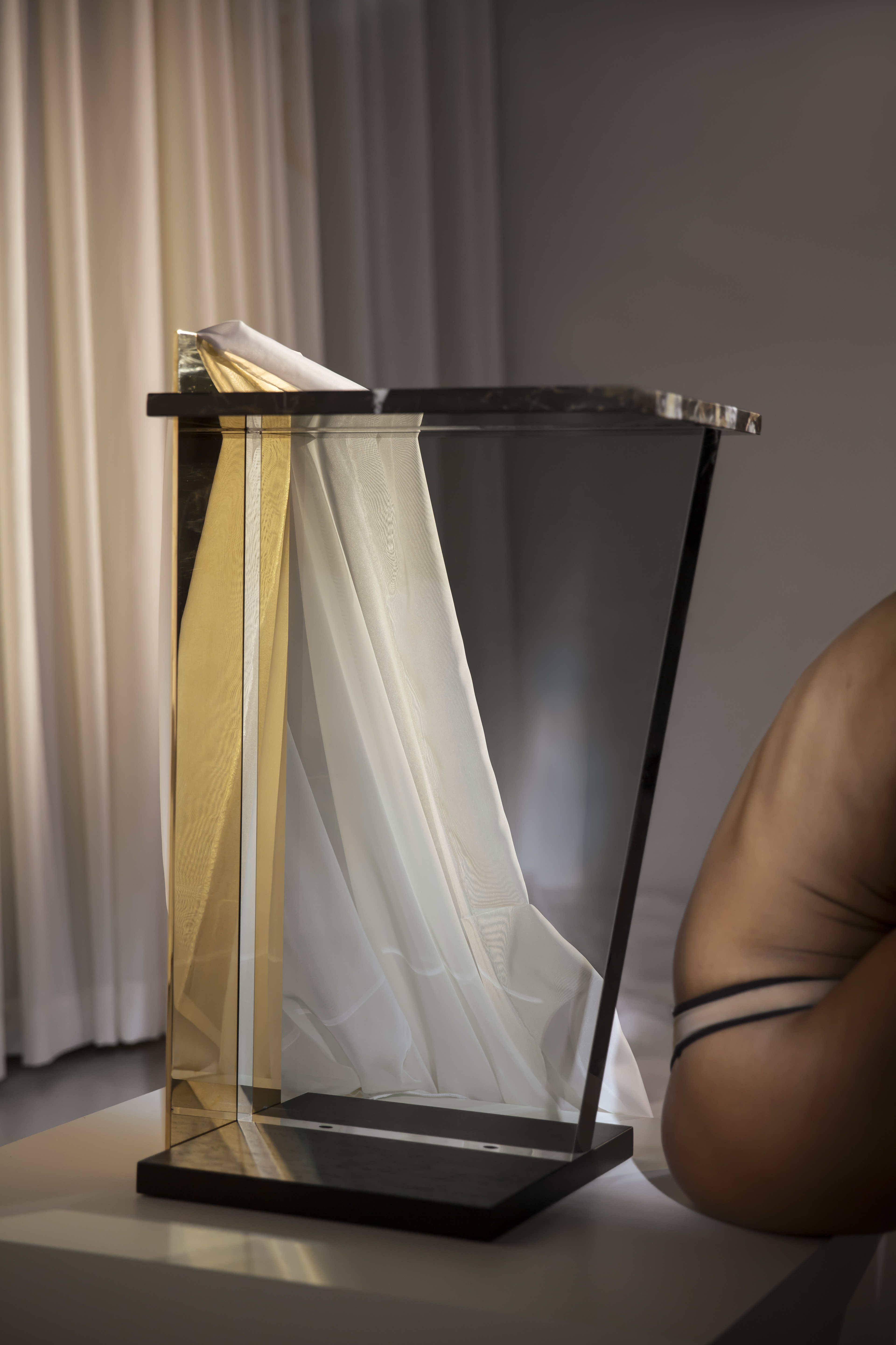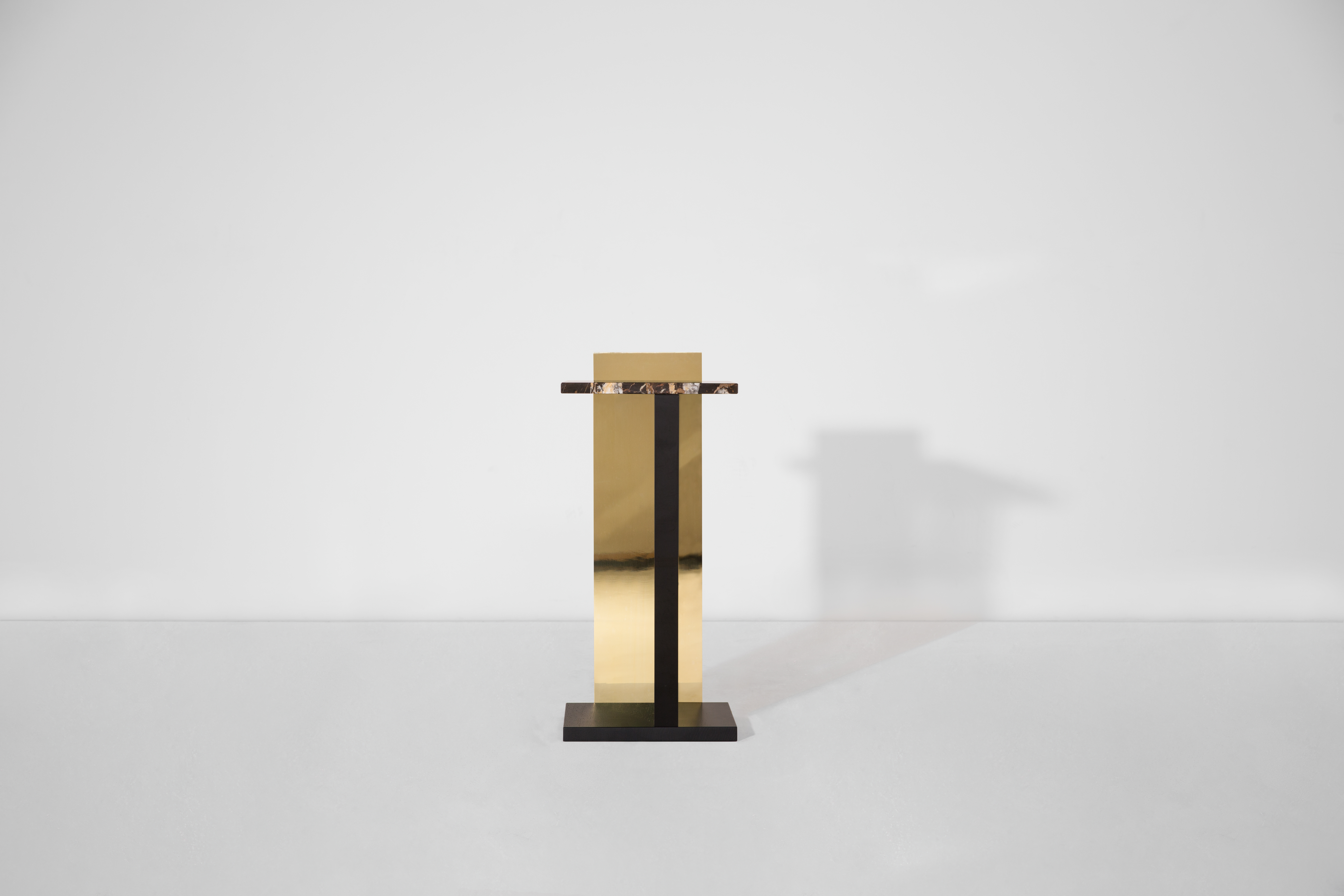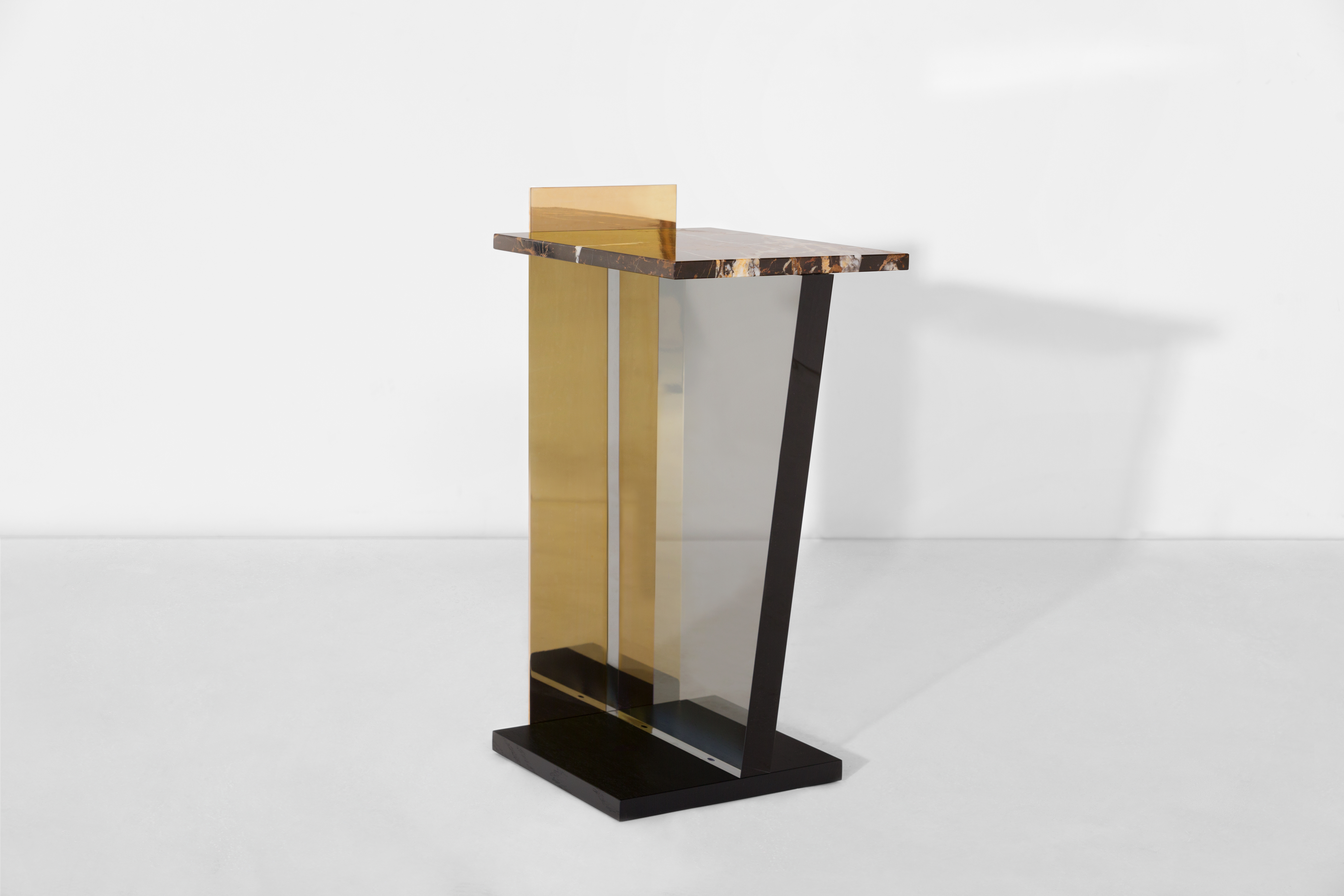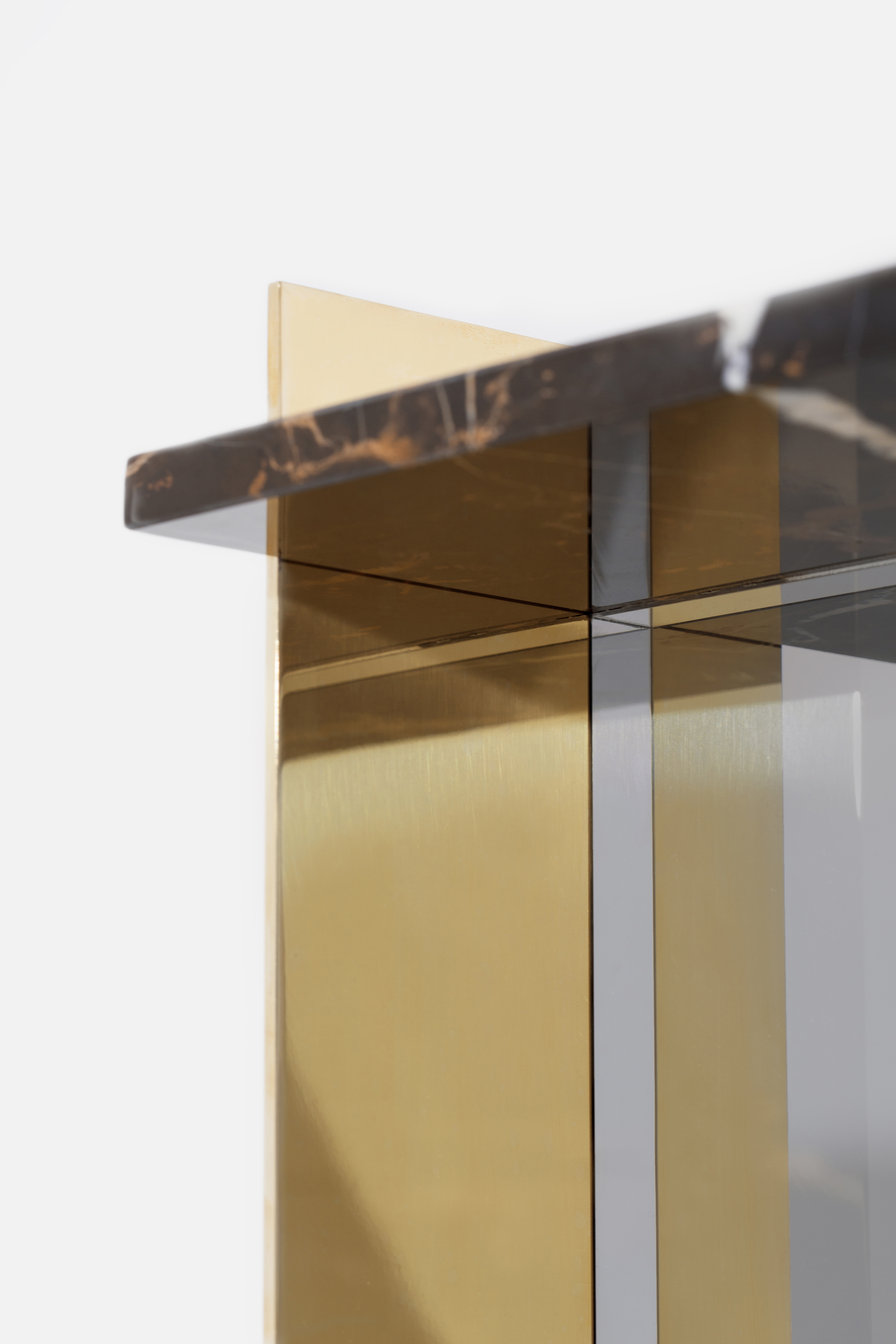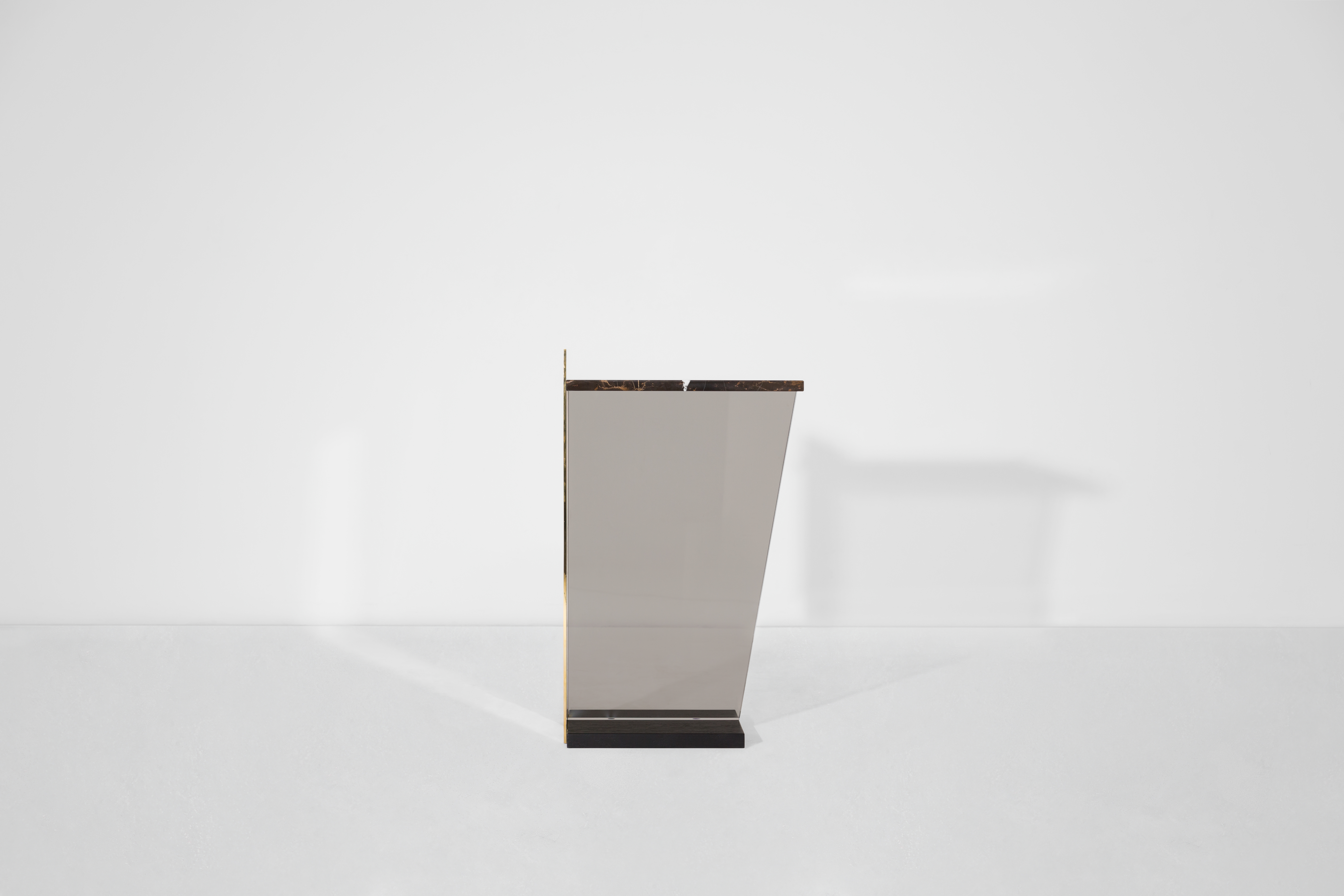 The Servant is at steady disposal to lock a secret inside the thickness of its acrylic glass. The grey acrylic is firm and strong, yet transparent and seemingly fragile. It forms the unexpected connection between a marble top and an oak base. Mirror polished brass serves as a distinct and supportive backdrop.