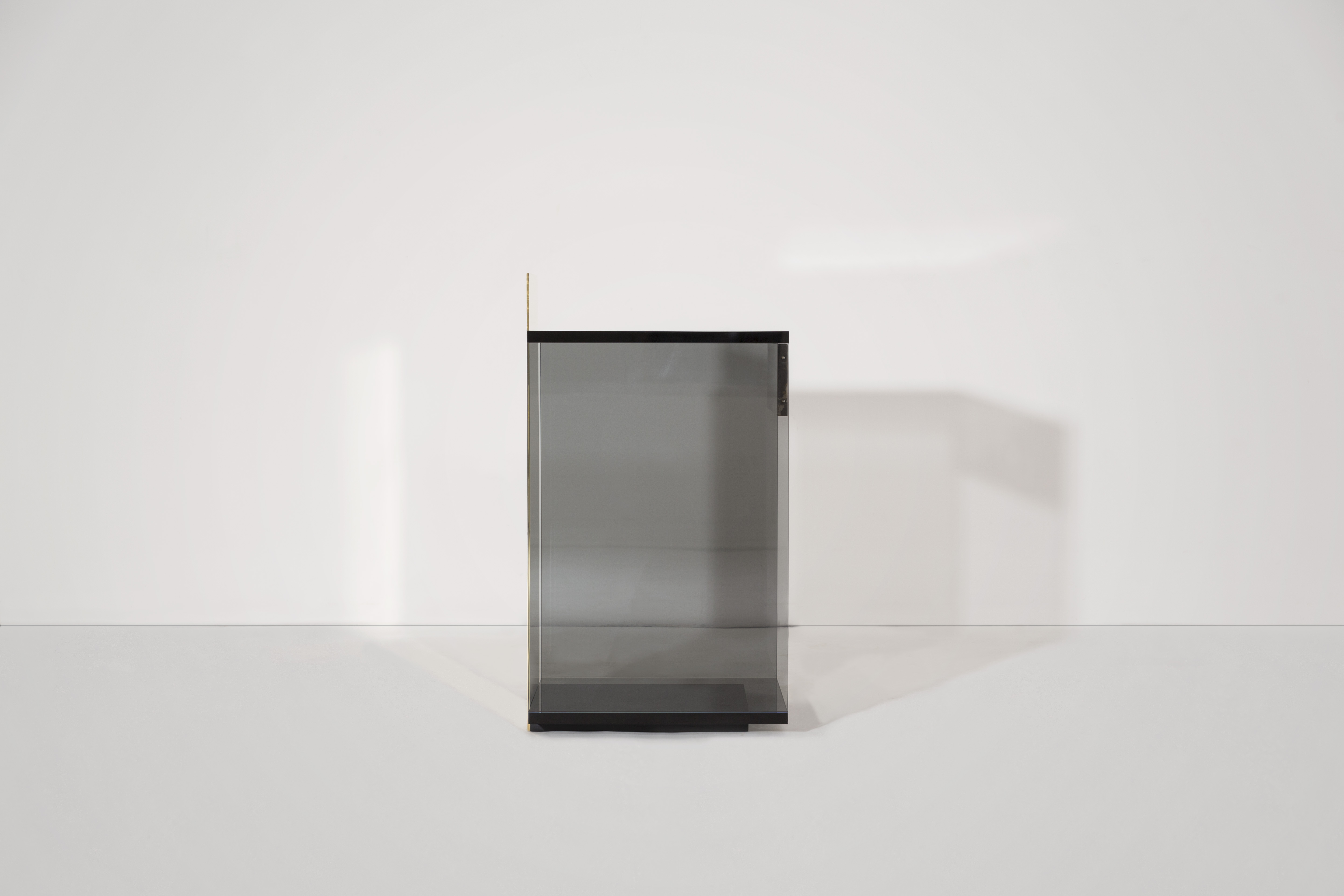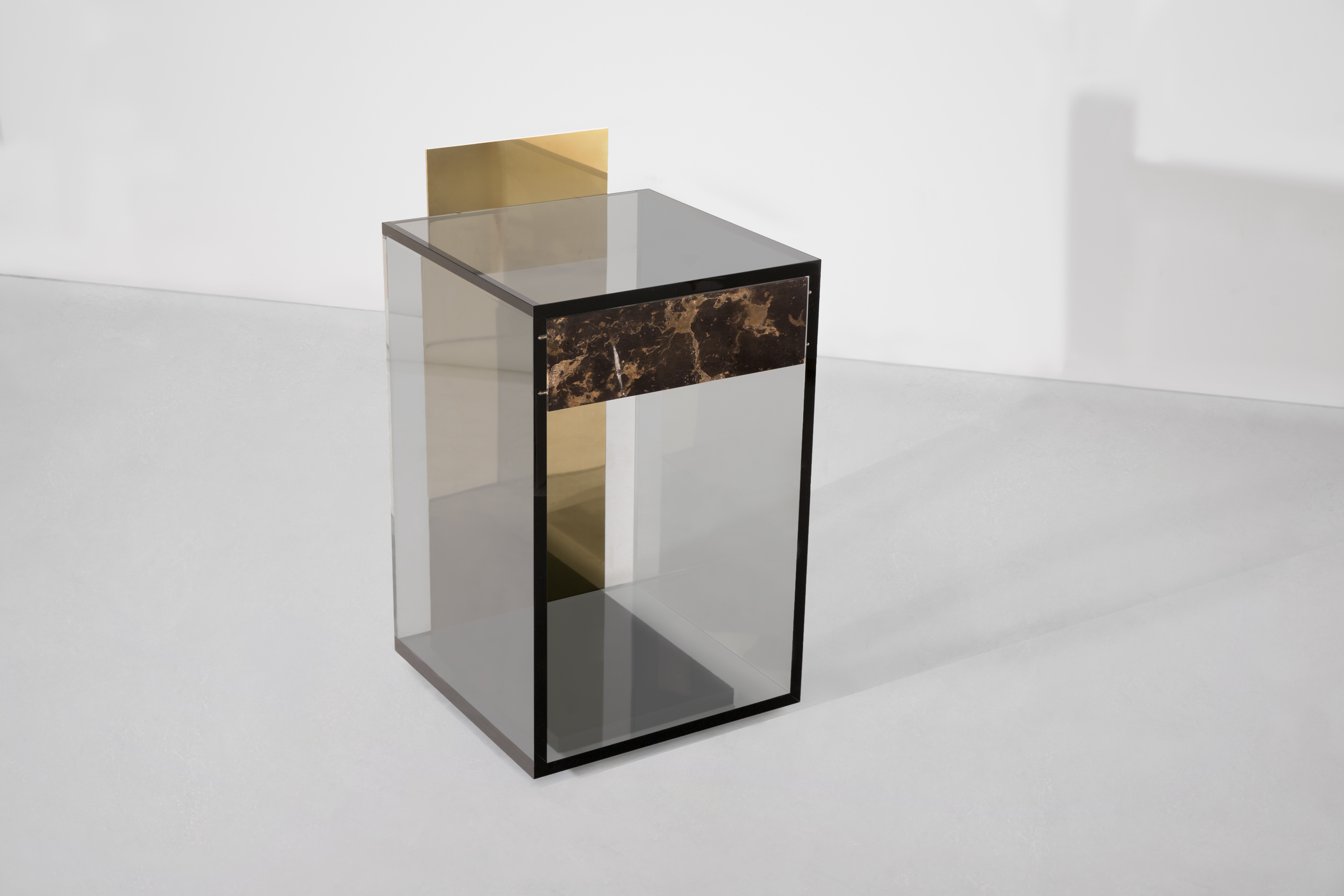 An abstracted icon that has wiped its traces, the Shrine is pure, saturated presence. Despite its elegant shape, it is heavy enough to withstand any change of time and weather. The marble’s mature vanity is held by a transparent acrylic frame and a base made of oak and mirror polished brass.