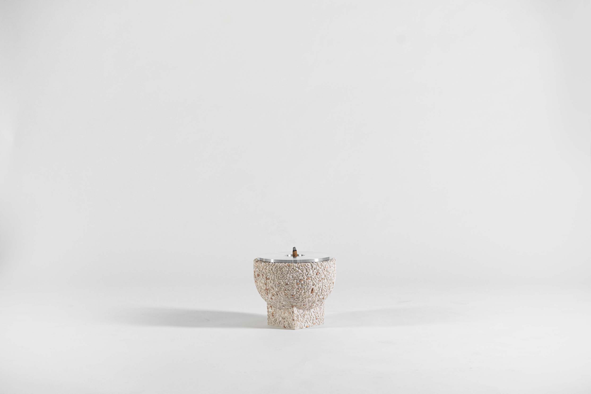 The smoker transports a calming vibe and comes along with rather spiritual intention. The stone carefully put on top is a hand carved artificial stone with a bespoke concrete recipe. Its appearance will always be the same because of its artificial nature. The material is carved and can be slipped over the incense scent.