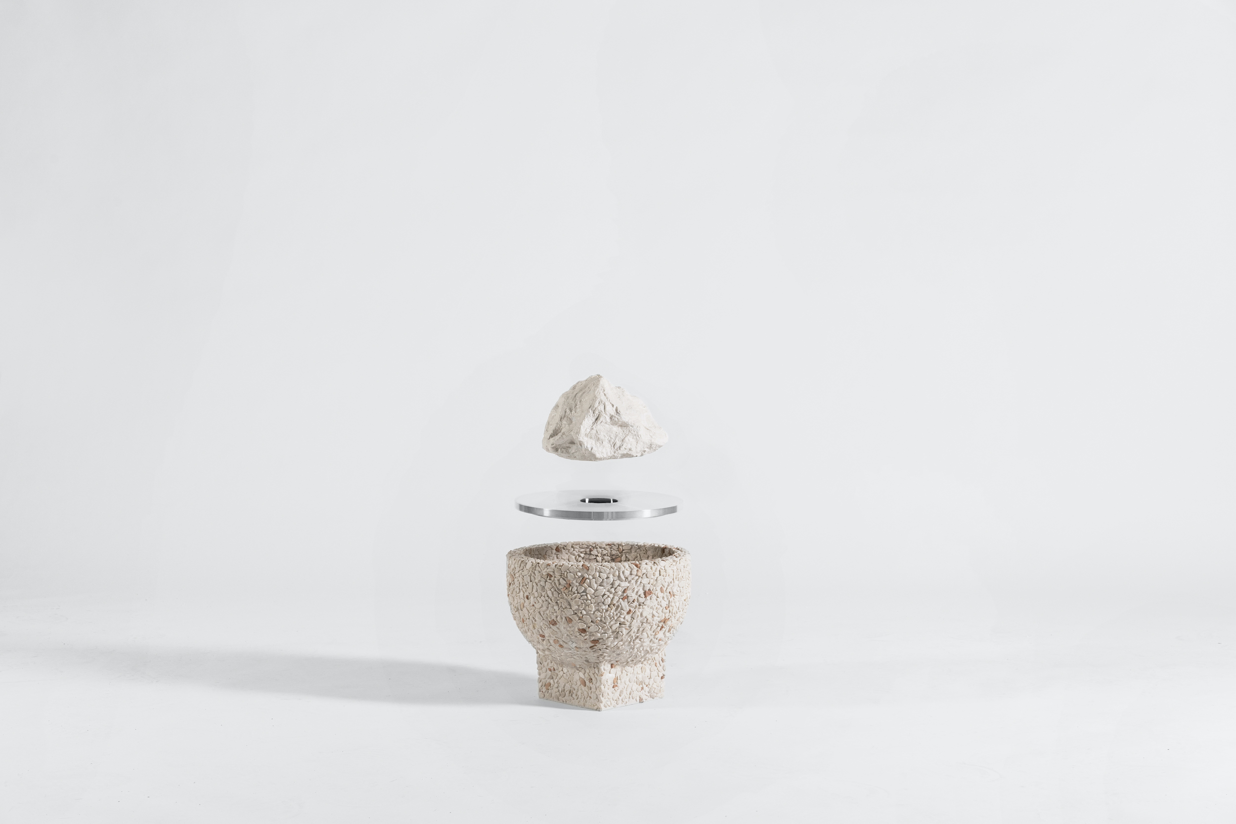 A square base carefully melts together with an extruded sphere closed by an aluminium disk. A hand carved and reproduced stone is placed on top. Inside the stone is a hollow space with a tiny chimney. Incense cones can be lit and covered up the stone. The light smoke leaks from the little hole precisely drilled into the stone. Material can be stored inside the object. Due to its moderate height the object is to be placed either on a sideboard or on the floor.