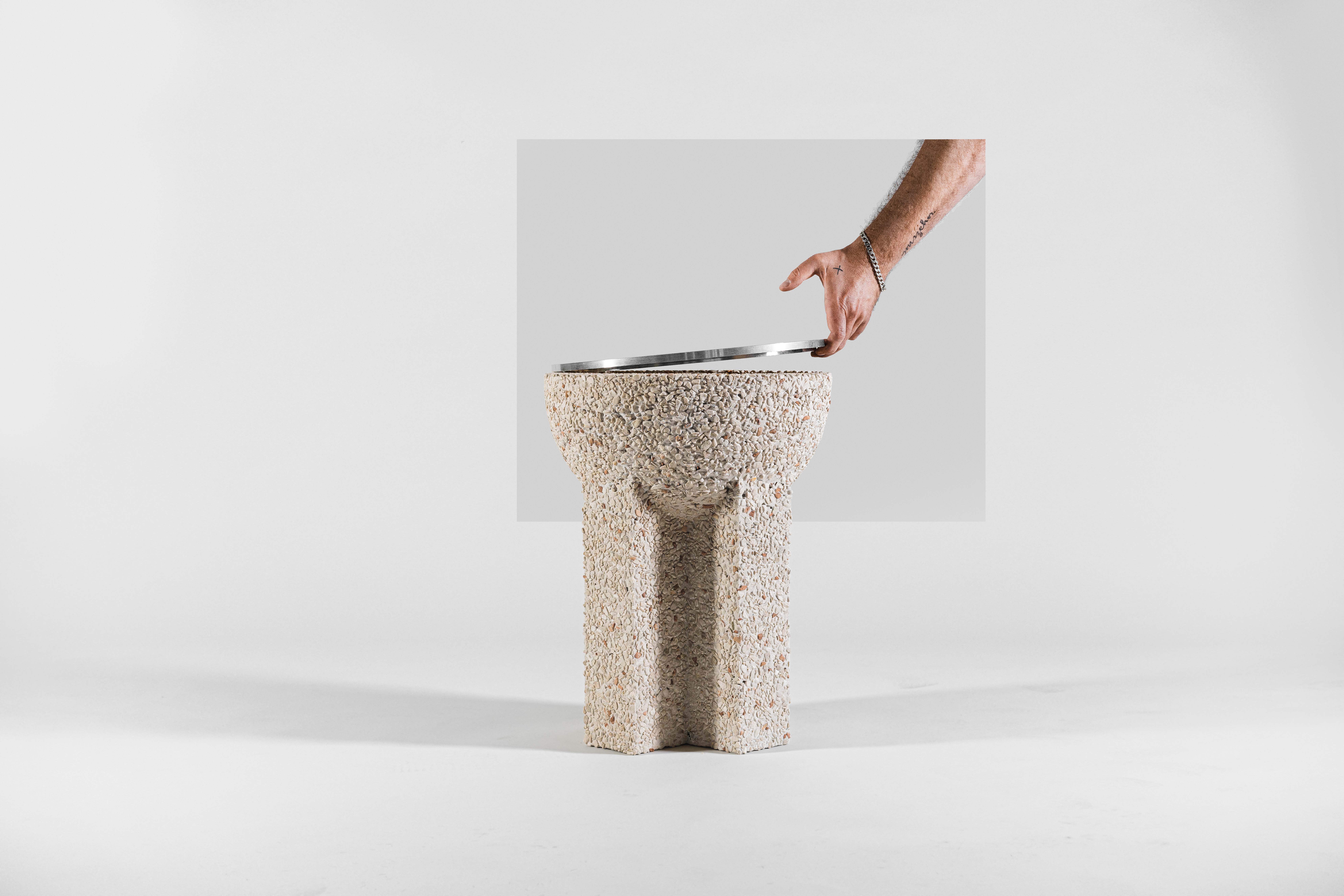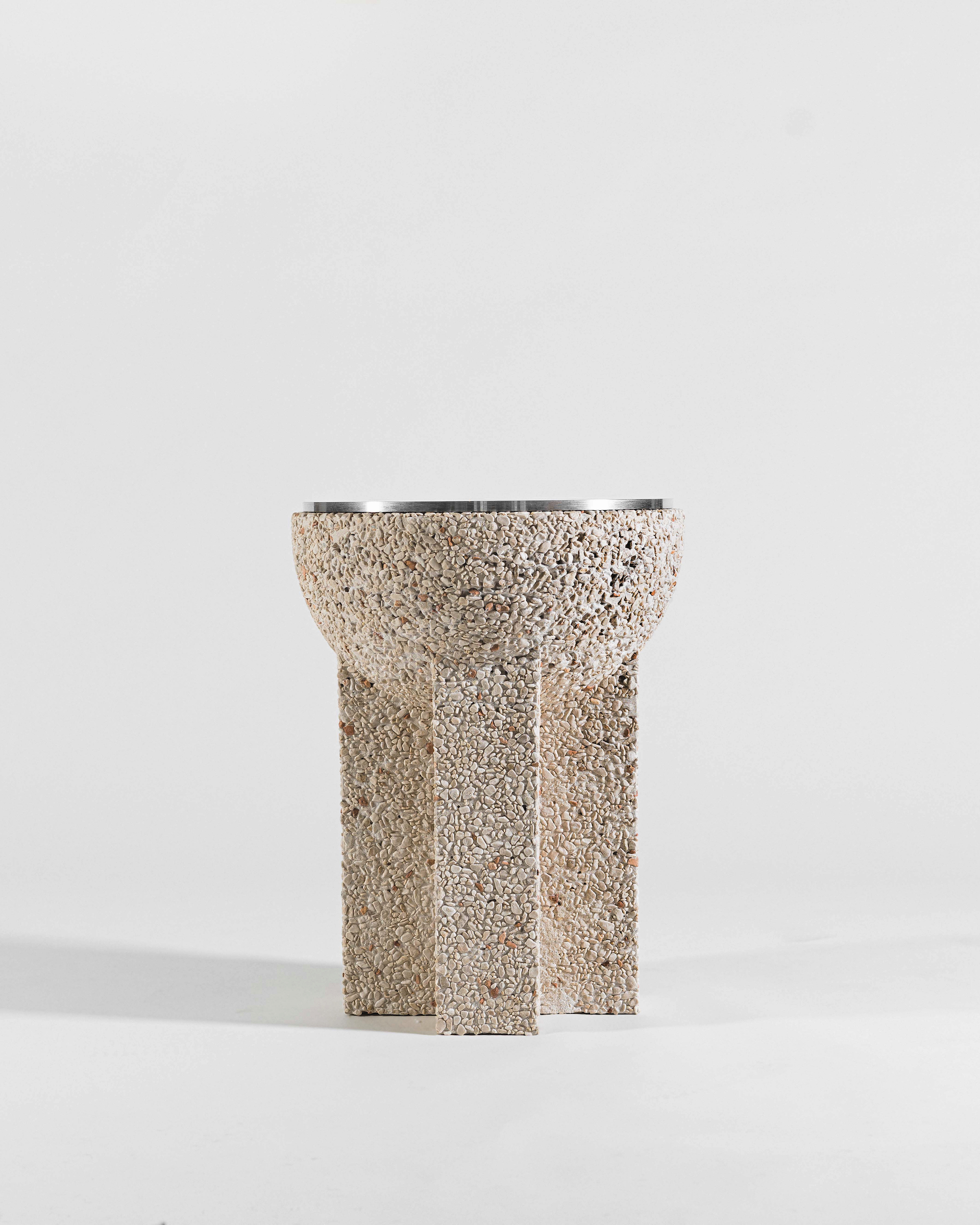 The table functions as a side table and has a very dominant aura when staged in an interior space. References from known geometric architectural elements can be interpreted into the piece which is opening up and embracing every item put on top. A table with characteristics of an ancient pillar.