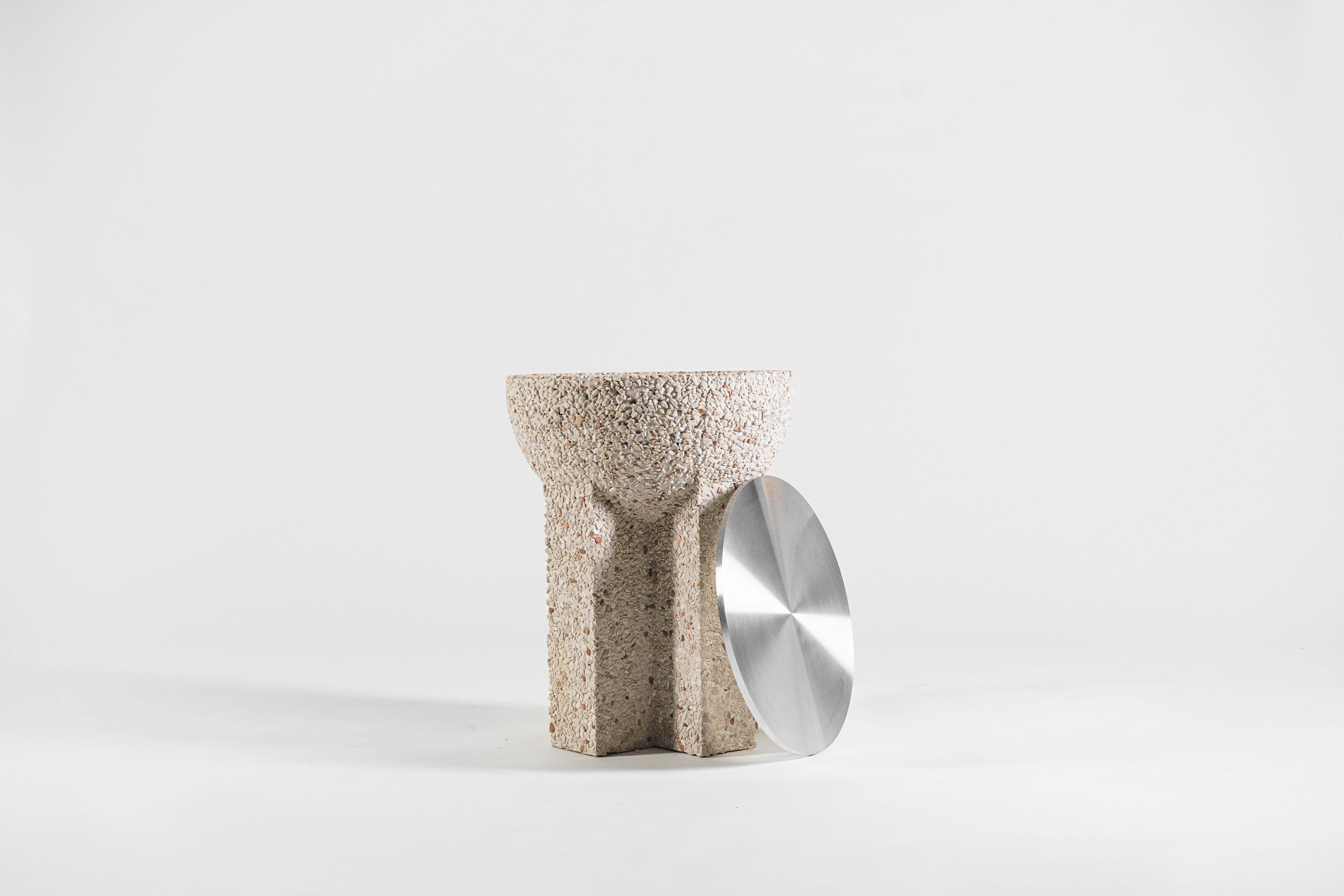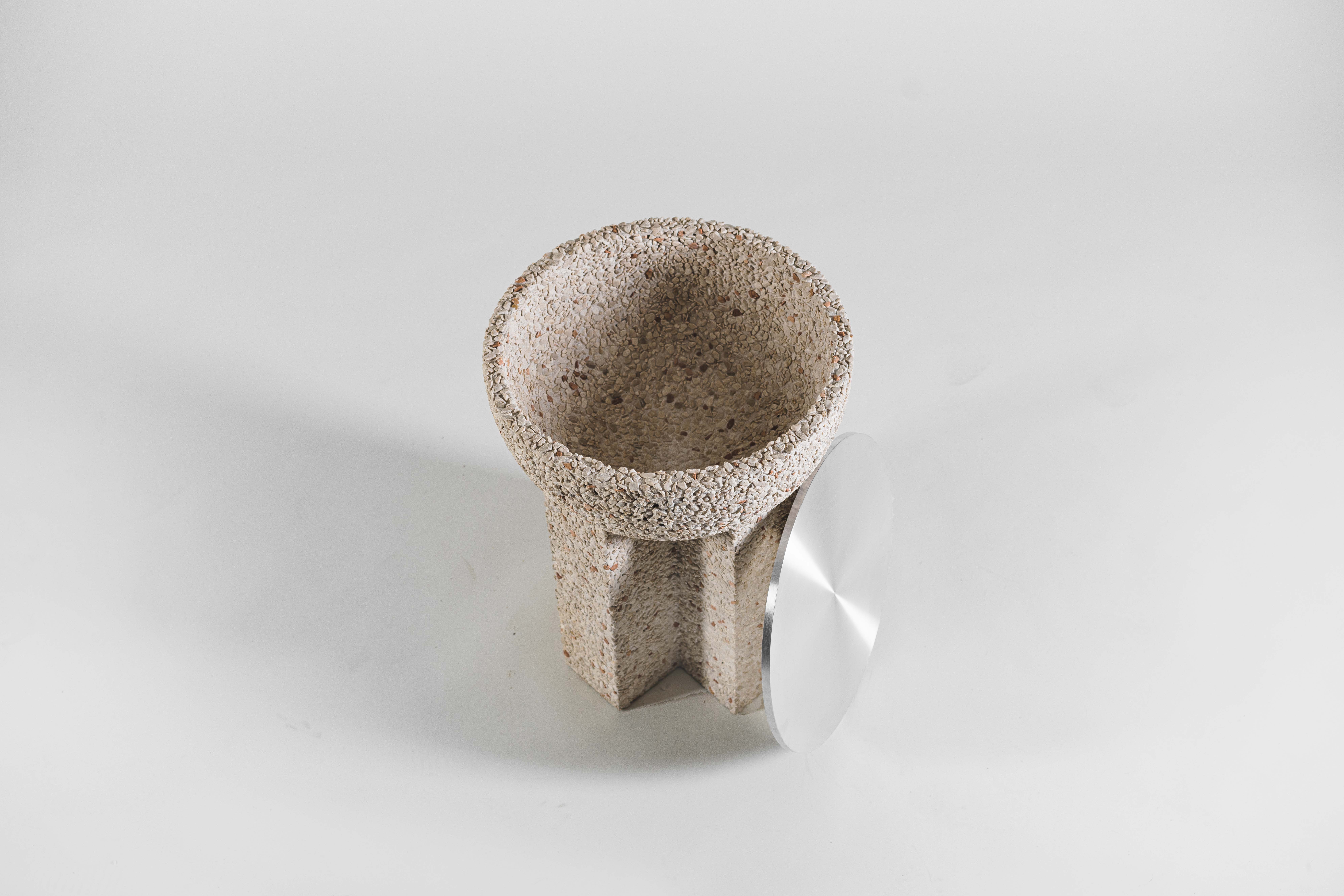 A cut off and hollow sphere emerges from a strong and firm cross column. The inner space is covered up by loose aluminium disk placed on top and can therefore be used as a hidden spot for storage. Its base consists of a solid concrete volume and therefore results in deliberate weight.