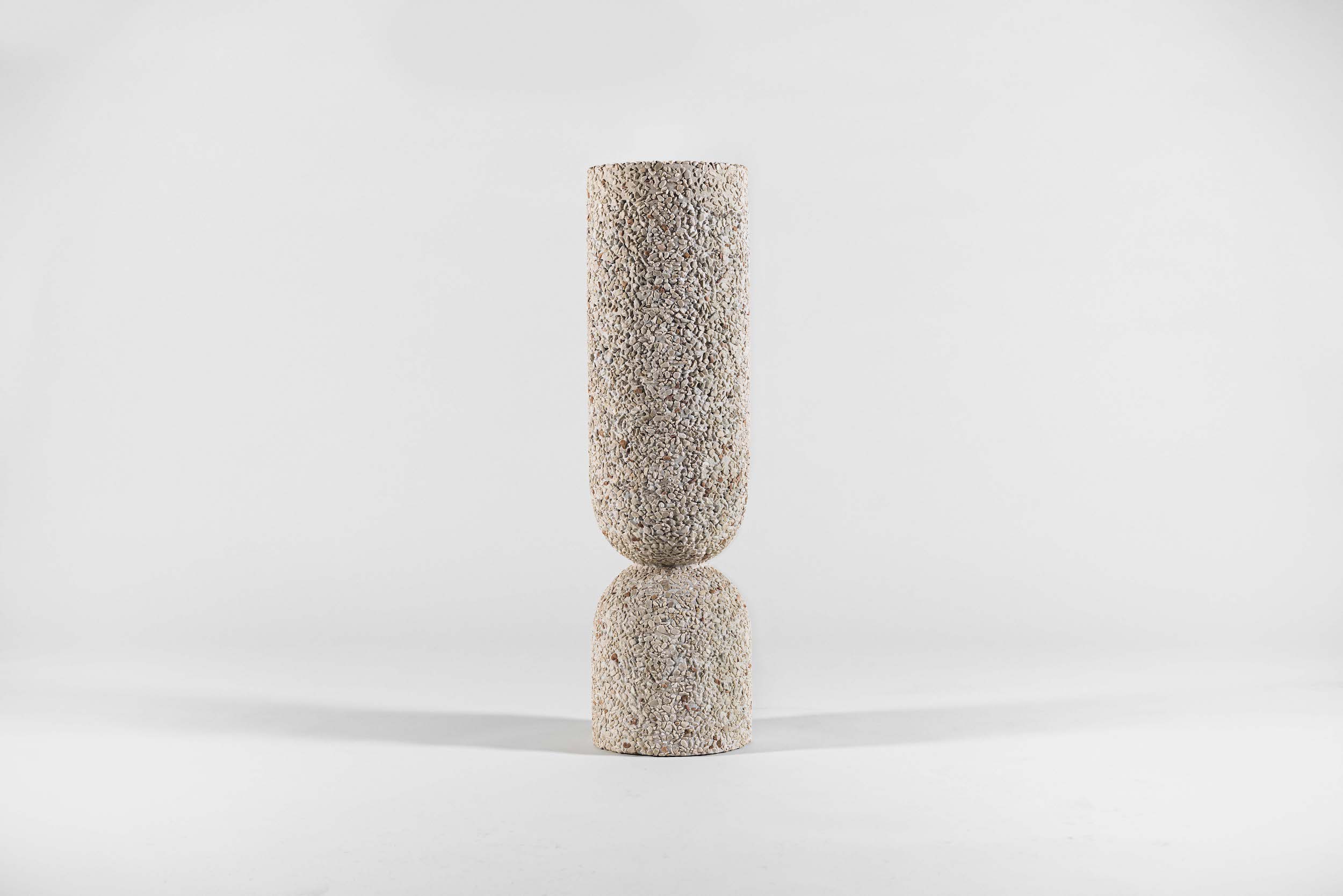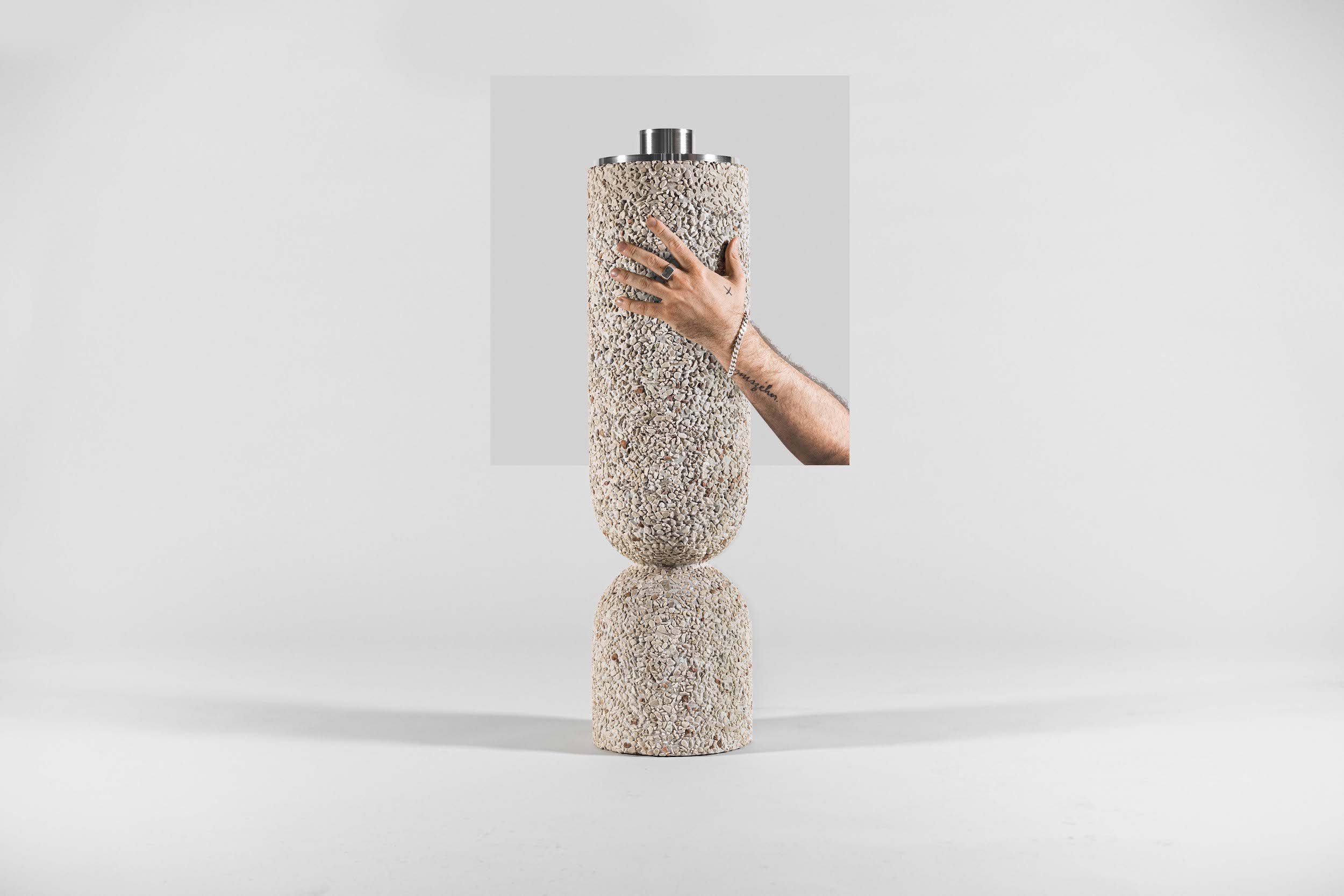 The vase can be easily assembled and used in two directions. Due to its size it is to be put on the floor and exist on its own. Exposed concrete dominates the objects, yet it’s easy to handle since both inner sides are hollow.