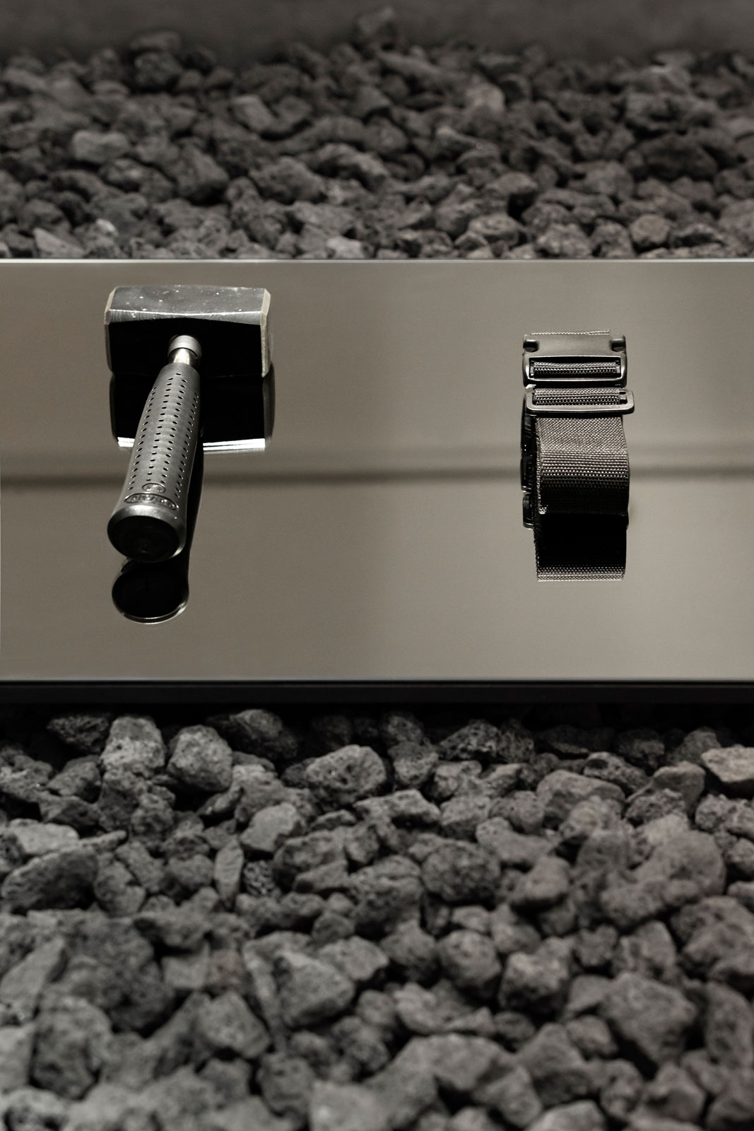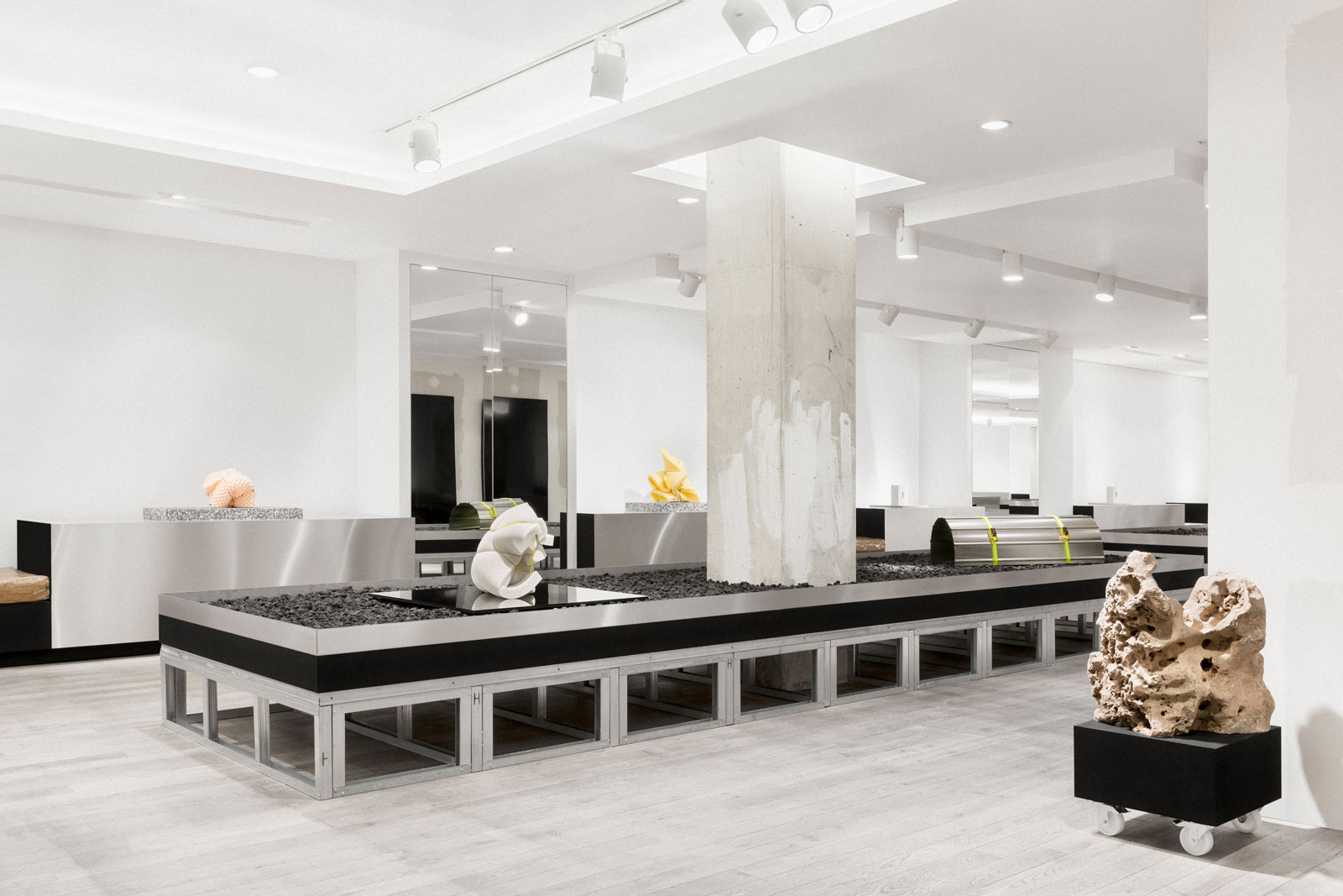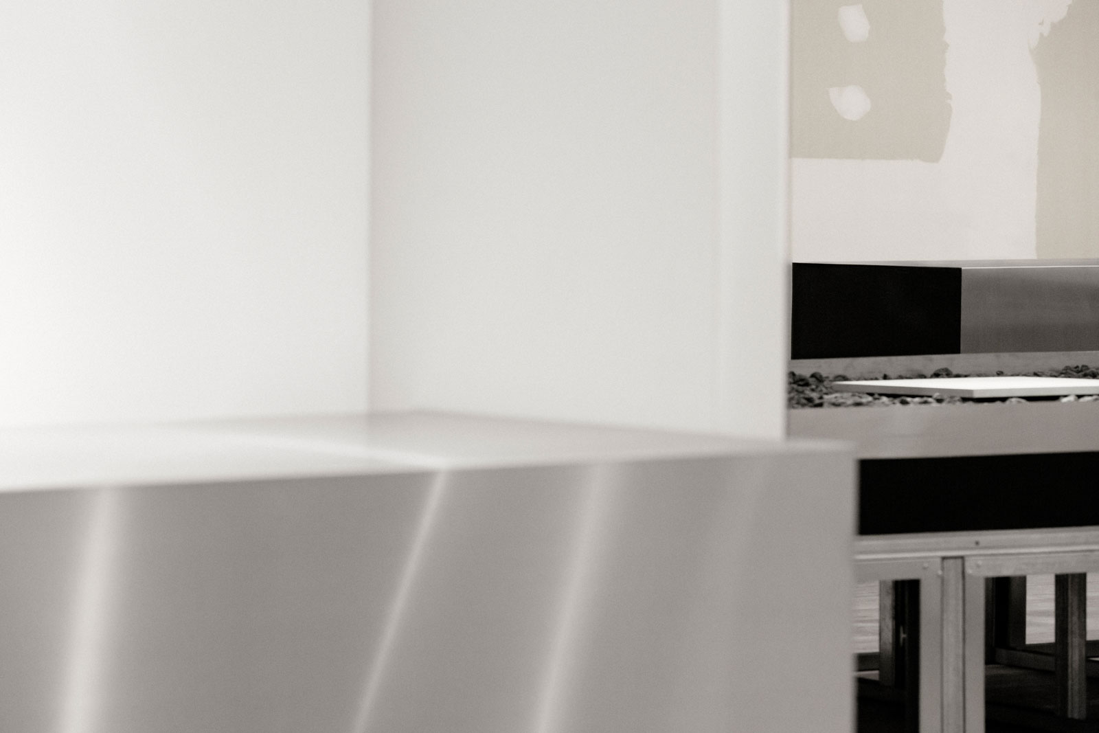 Sleek but bold stainless steel side displays give space for a maximum amount of freedom concerning the arrangement of products. In the end all objects are displayed on softly reflective materials to underline their importance and value.