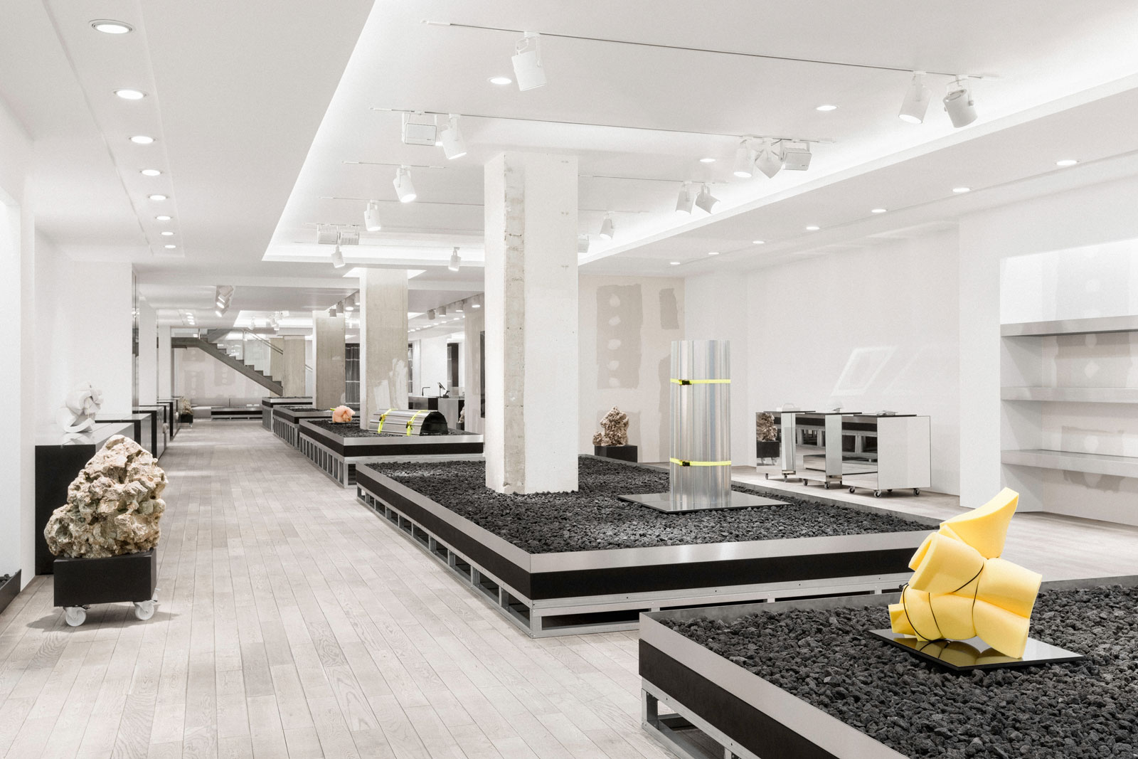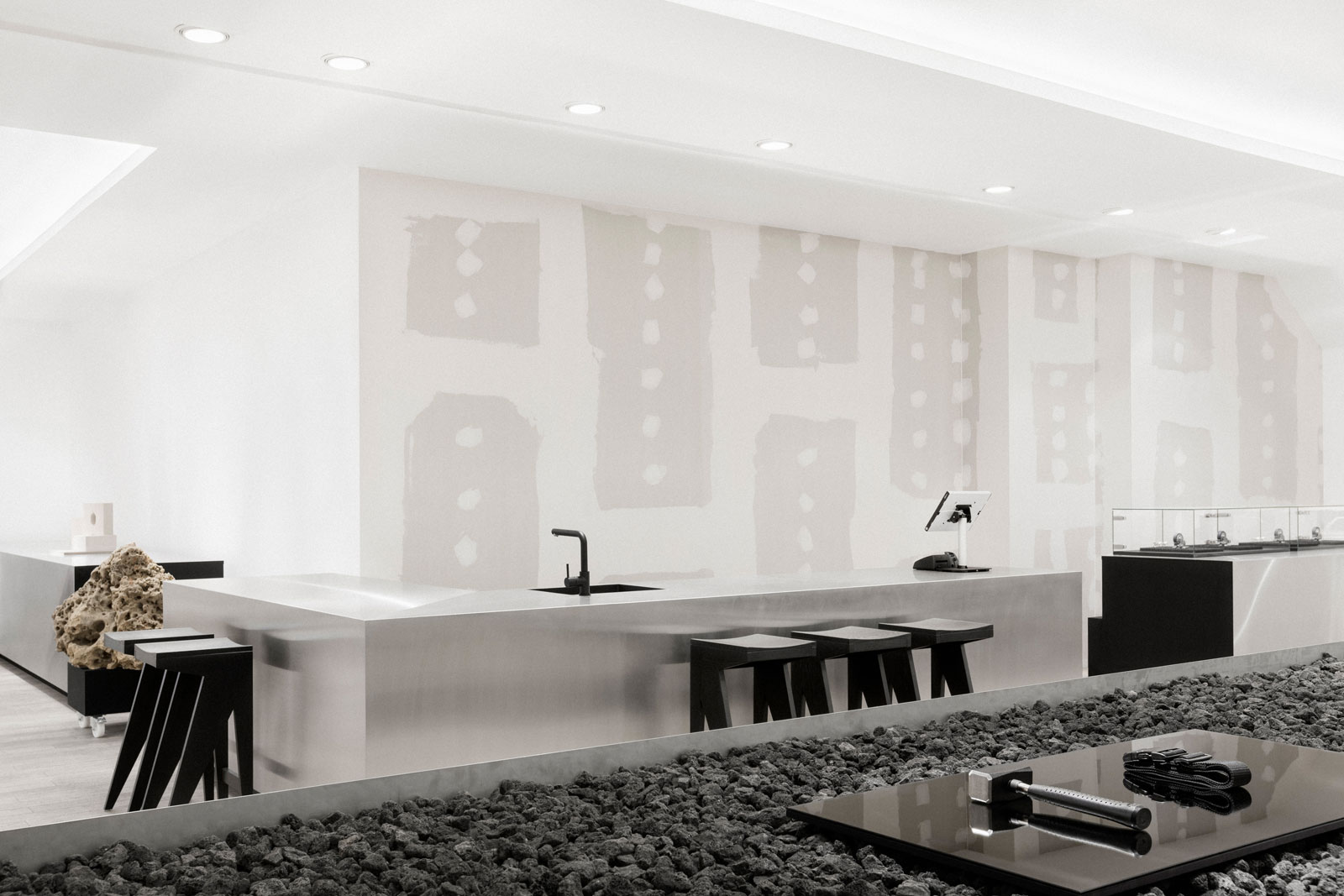 The spacious concept store for technical goods and innovative start-up products is driven by a minimal aesthetic. The overall idea is to keep some of the building site’s natural look and to bring it together with an eclectic use of materials to avoid traditional finishes of any kind.
