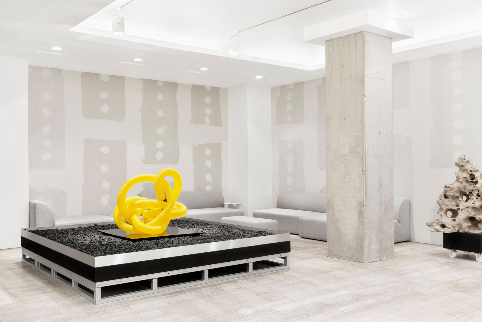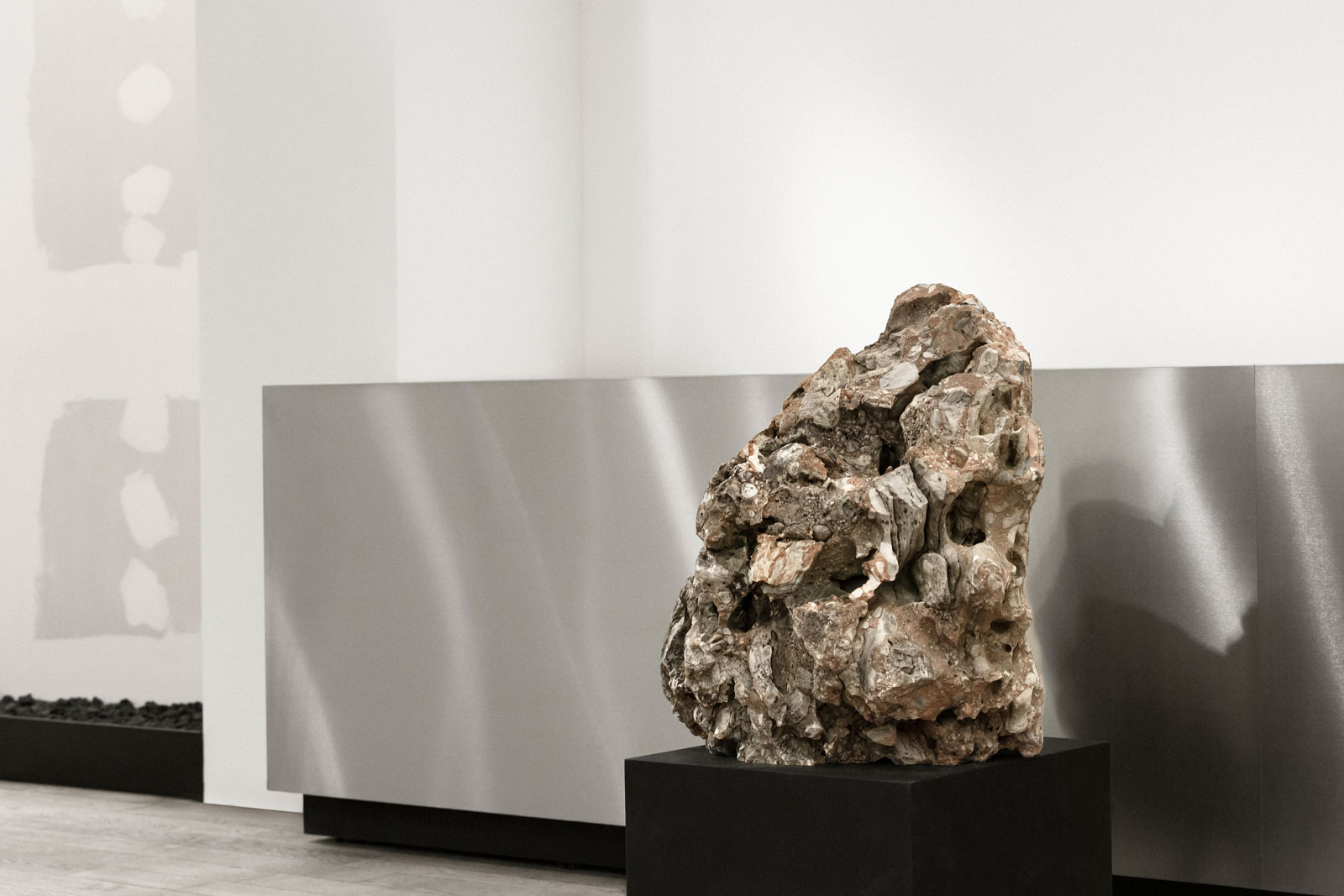 As the task was to provide every object display with electricity, a principle of hiding the sources with stone gravel was created. The gravel has a strong connection to one of the founder’s heritage and impressive erratic blocks of stone, placed on custom drays, gain the customers attention and calm, complete the artistic design approach.