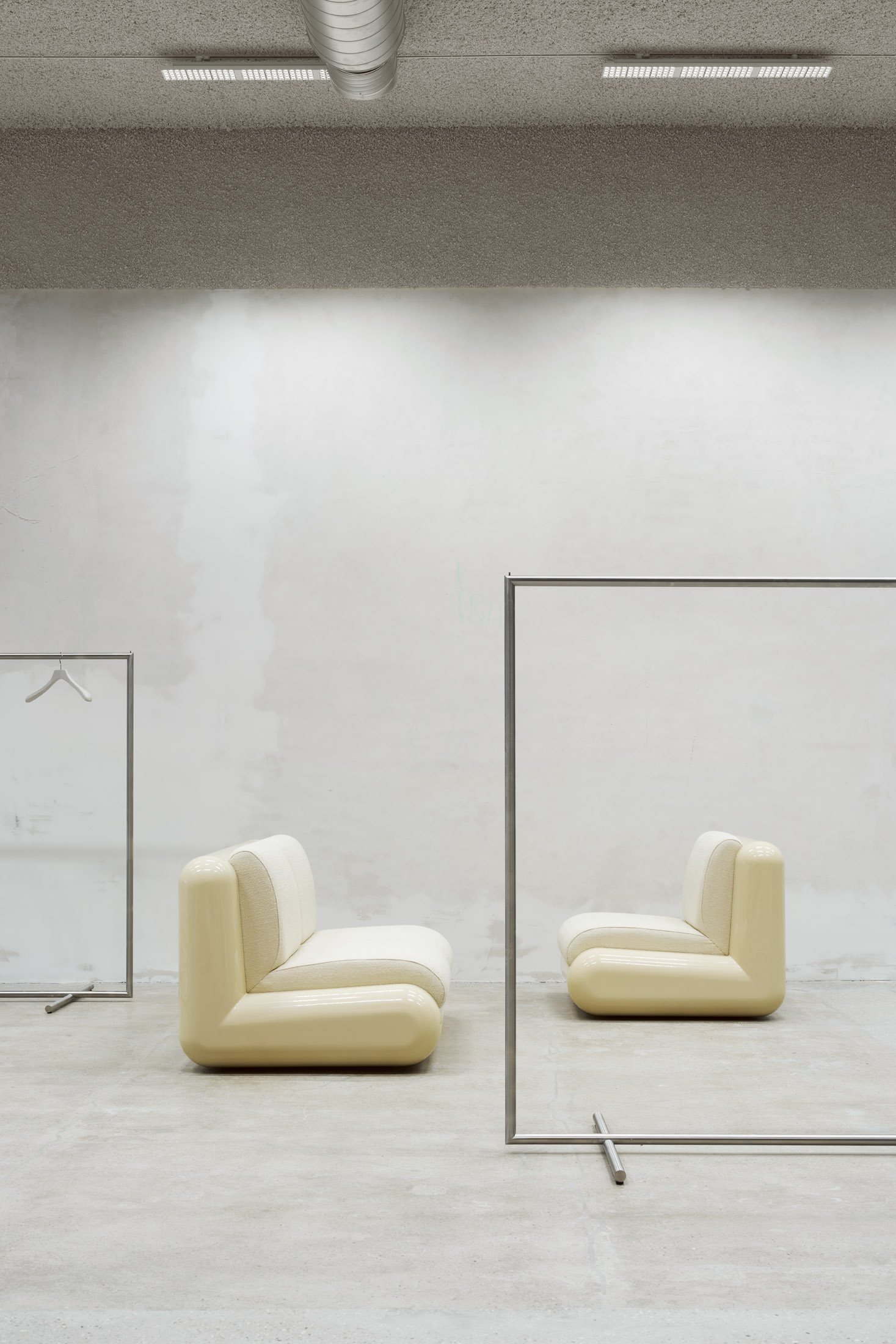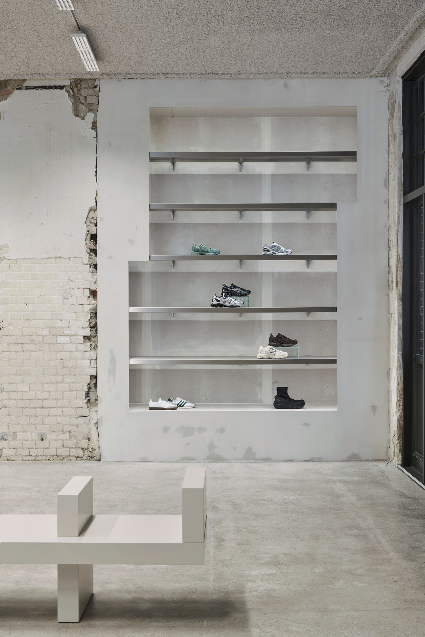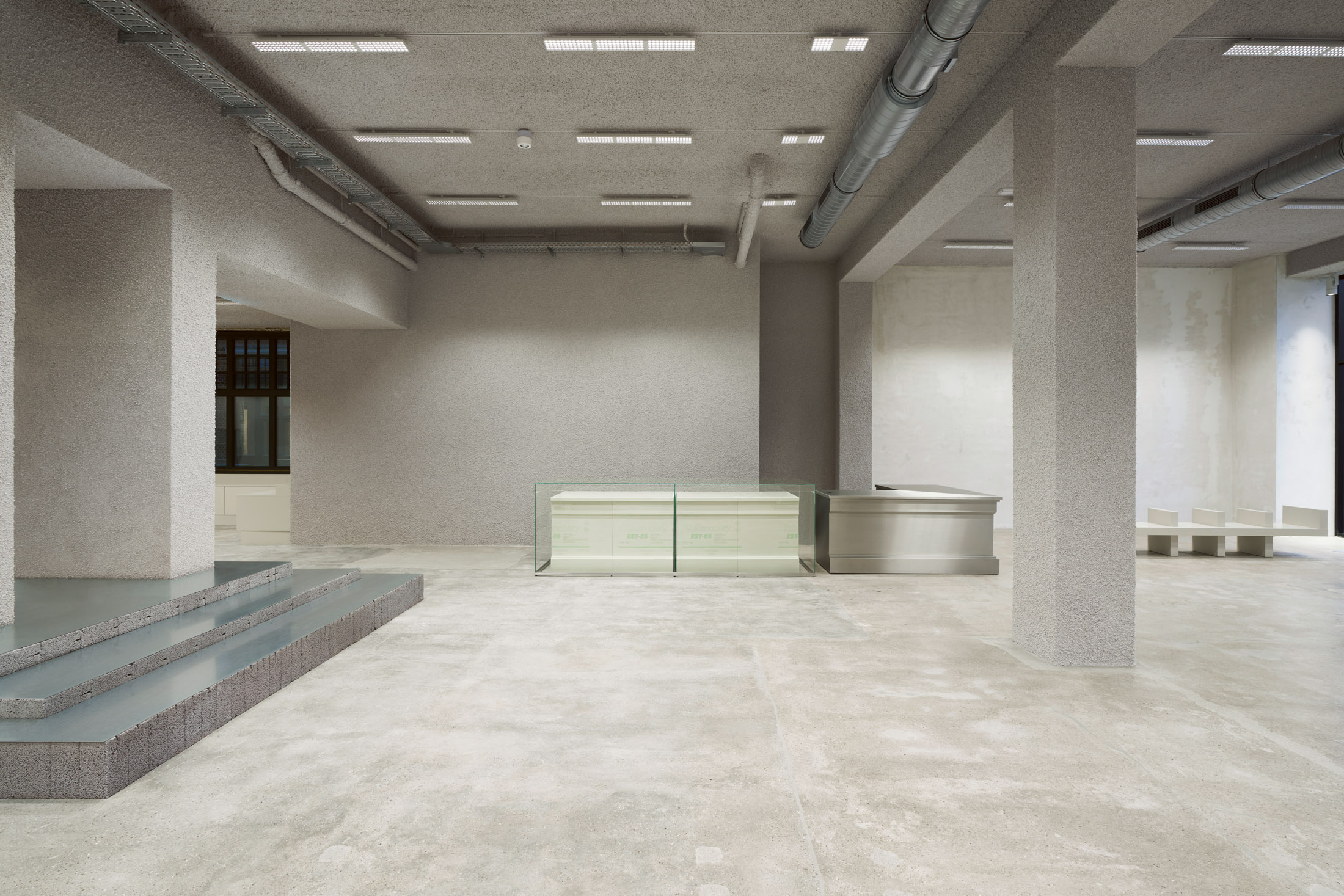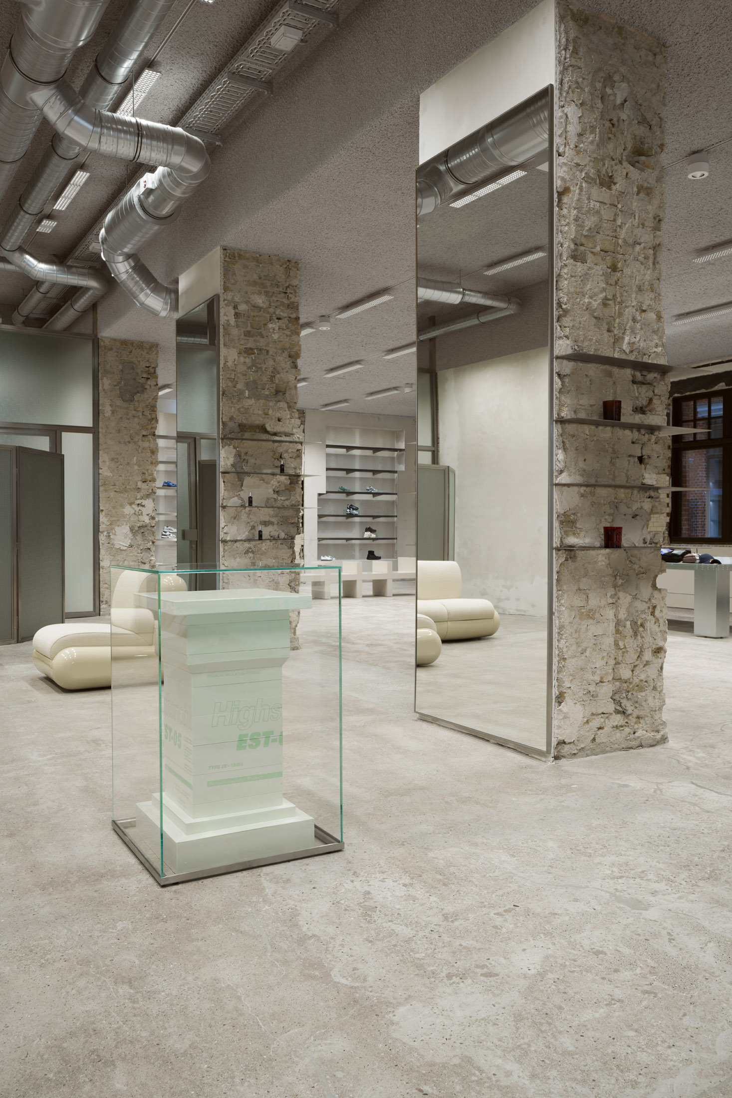 The result is a captivating atmosphere with a sanded concrete floor, warm grey sprayed ceiling and rough columns and walls that tell the story of the building. These are contrasted by sleek interventions such as stainless steel shelves embedded in the wall and metal shelves recessed into the wall. An ERCO lighting concept creates the perfect atmosphere, and the checkout interprets the building's ornamentation with a juxtaposition of contemporary materials - wired glass, polystyrene and stainless steel. a paravent made of stainless steel, wired glass and mirrors, conceals changing rooms and offers a touch of voyeurism with wired glass partitions.