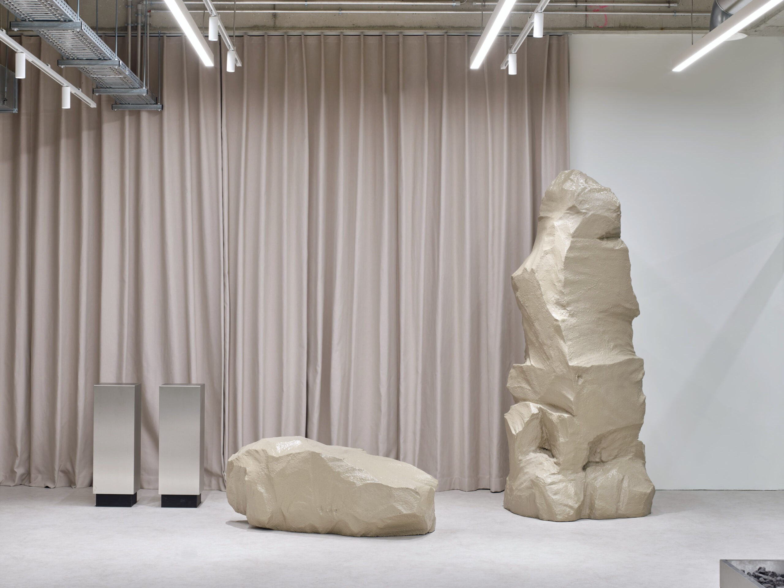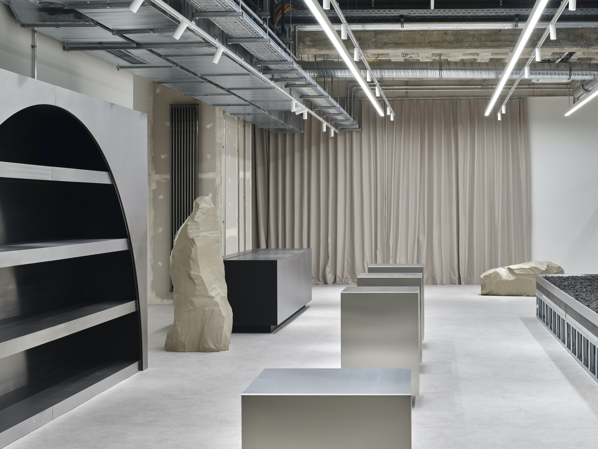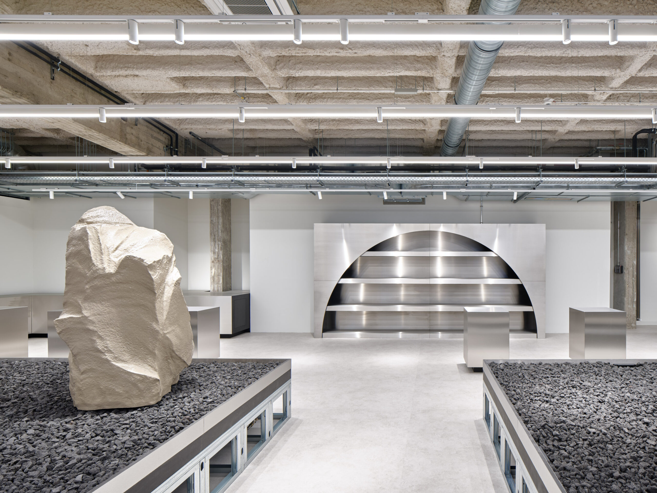 As the task was to provide every object display with electricity, a principle of hiding the sources with stone gravel was created. The gravel has a strong connection to one of the founder’s heritage and impressive erratic blocks of stone, placed on custom drays, gain the customers attention and calm, complete the artistic design approach. Sleek but bold stainless steel side displays give space for a maximum amount of freedom concerning the arrangement of products. In the end all objects are displayed on softly reflective materials to underline their importance and value.